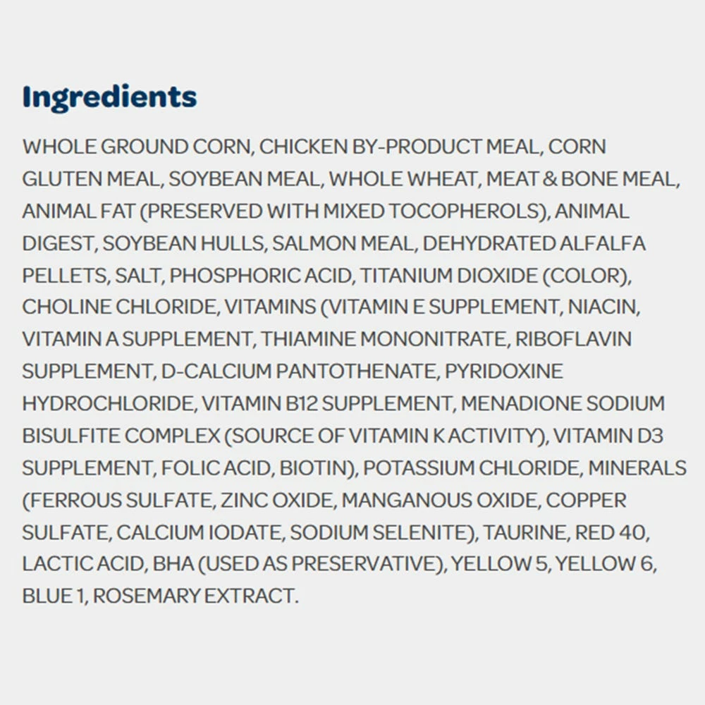 Whole Ground Corn, Chicken By-Product Meal, Corn Gluten Meal, Soybean Meal, Whole Wheat, Meat & Bone Meal, Animal Fat (Preserved With Mixed Tocopherols), Animal Digest, Soybean Hulls, Salmon Meal, Dehydrated Alfalfa Pellets, Salt, Phosphoric Acid, Titanium Dioxide (Color), Choline Chloride, Vitamins (Vitamin E Supplement, Niacin, Vitamin A Supplement, Thiamine Mononitrate, Riboflavin Supplement, D-Calcium Pantothenate, Pyridoxine Hydrochloride, Vitamin B12 Supplement, Menadione Sodium Bisulfite Complex (Source Of Vitamin K Activity), Vitamin D3 Supplement, Folic Acid, Biotin), Potassium Chloride, Minerals (Ferrous Sulfate, Zinc Oxide, Manganous Oxide, Copper Sulfate, Calcium Iodate, Sodium Selenite), Taurine, Red 40, Lactic Acid, Bha (Used As Preservative), Yellow 5, Yellow 6, Blue 1, Rosemary Extract.
