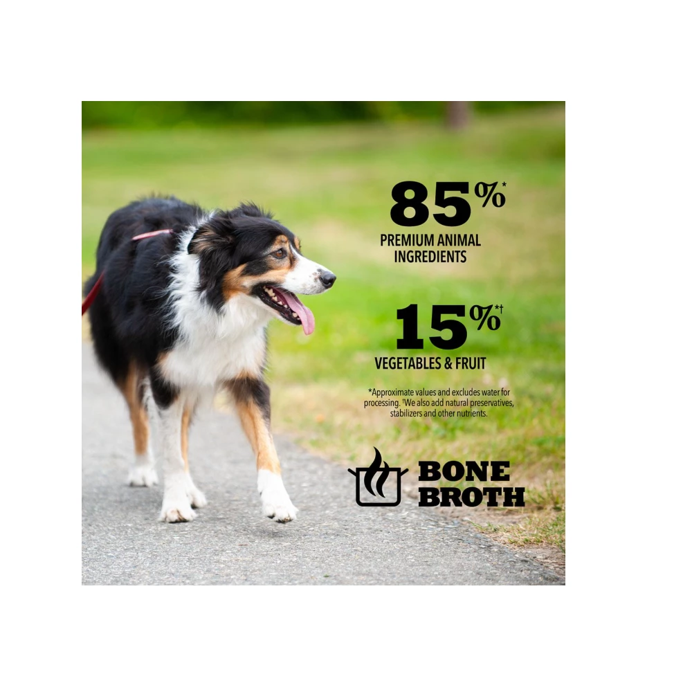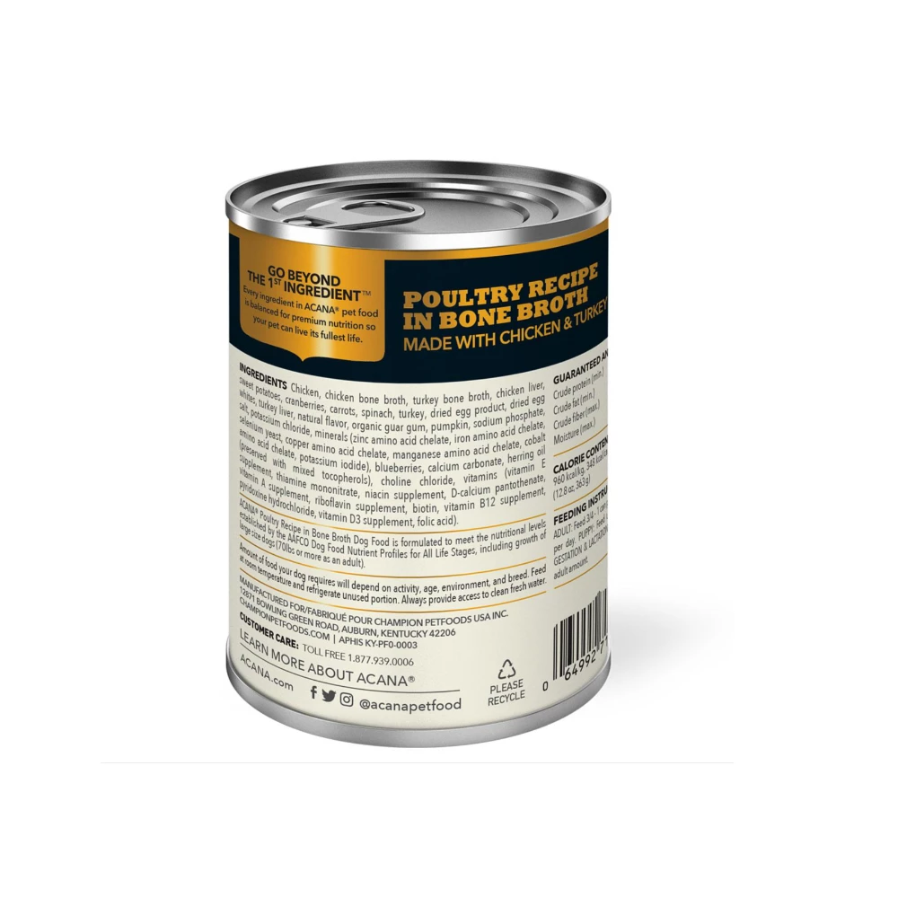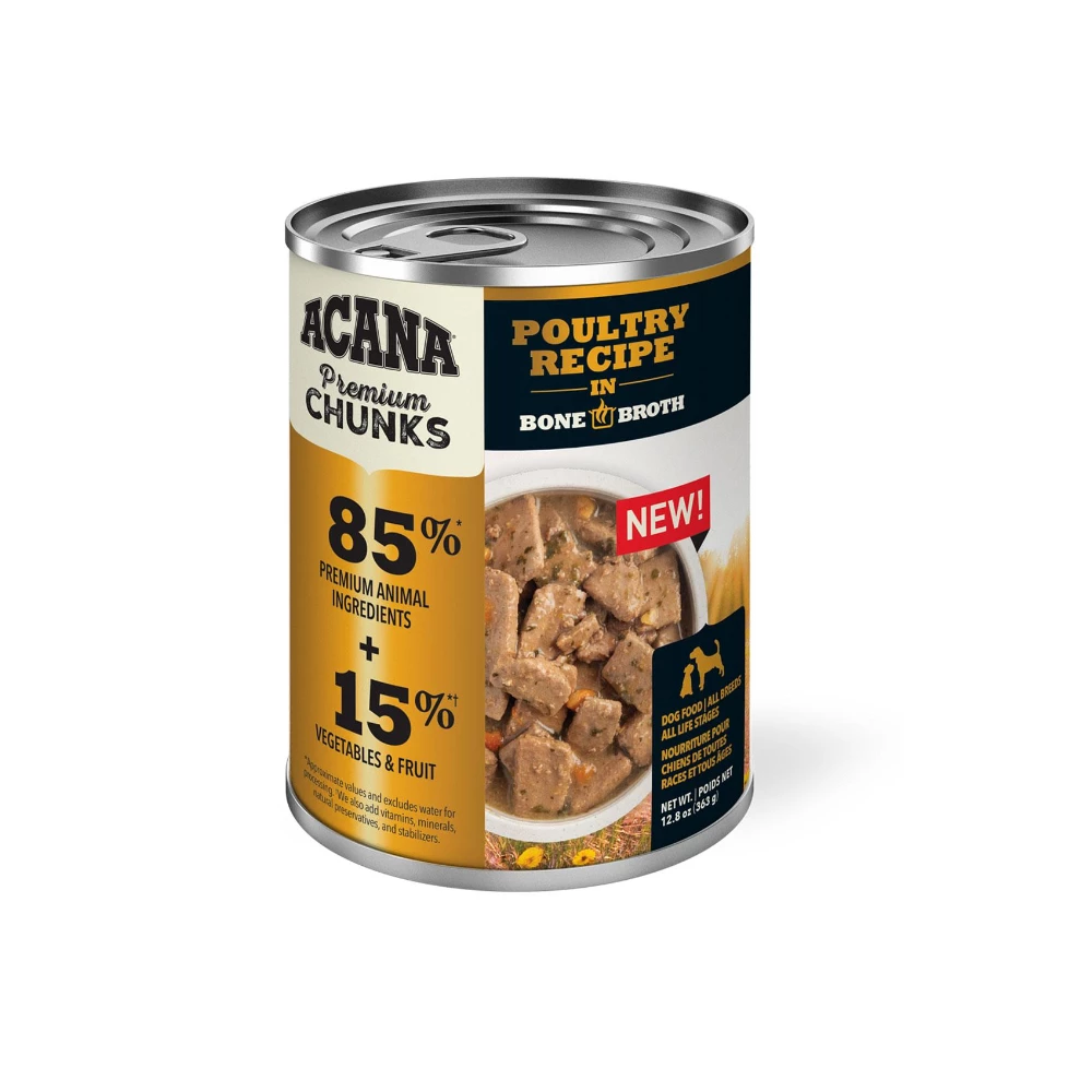 With ACANA food for dogs, we always Go Beyond The 1st Ingredient, and every can of ACANA Premium Chunks is crafted thoughtfully from start to finish. Our Poultry Recipe in Bone Broth is crafted with 85%* animal ingredients including premium chunks of poultry, balanced with 15%* visible fruit and vegetables, all in a savory bone broth base. Add it as a topper on your dog’s favorite ACANA kibble to provide them with more hydration and crave-worthy flavor, or feed alone for an indulgent treat at mealtime.*Approximate and derived from the unprocessed state of the ingredients. We also add essential vitamins and minerals, natural preservatives and probiotics.
