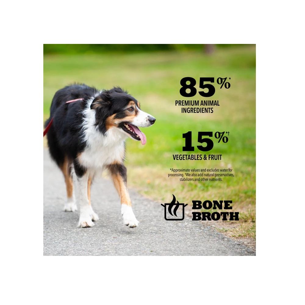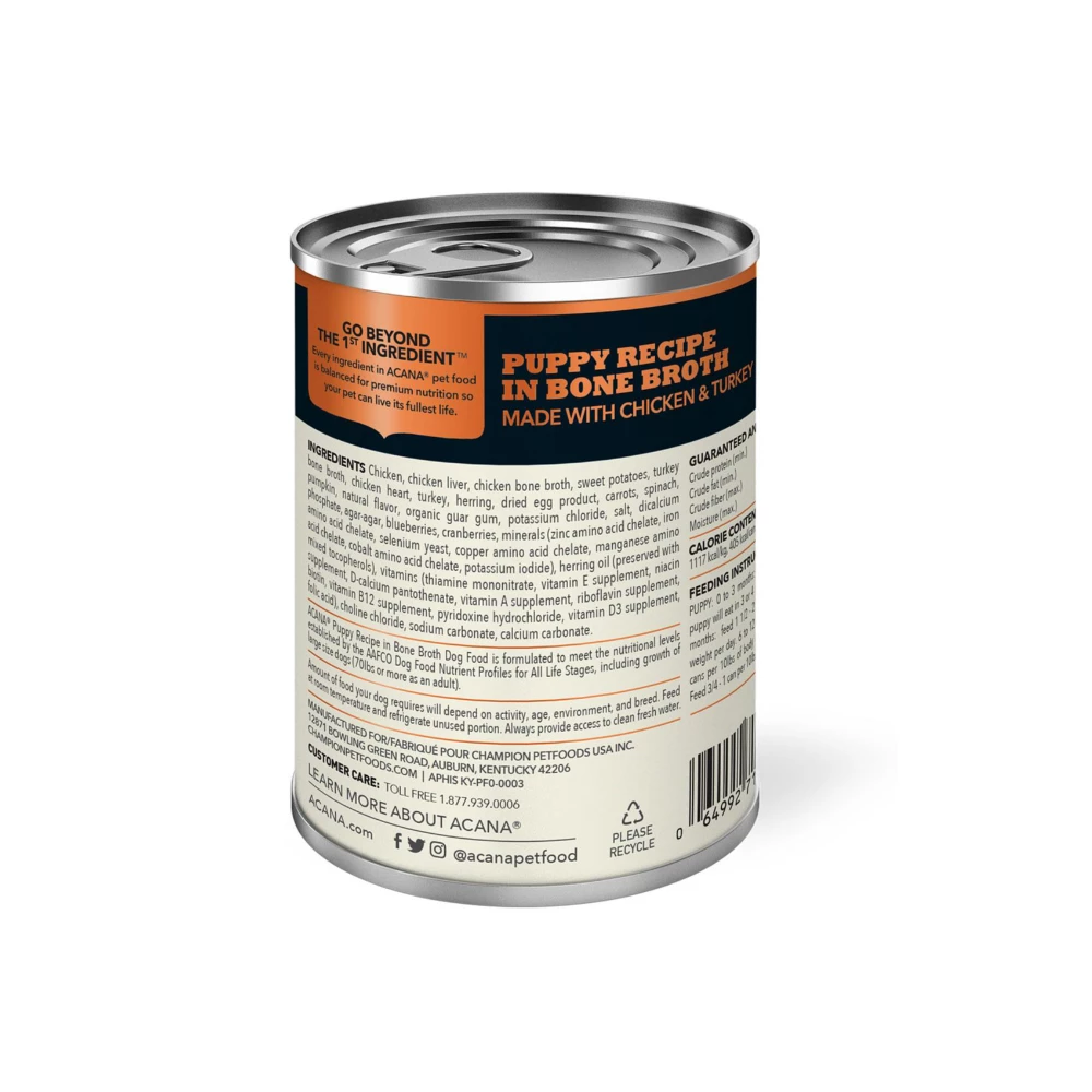 ACANA food for dogs always Goes Beyond The 1st Ingredient, and every can of ACANA Premium Chunks is crafted thoughtfully from start to finish. Our Puppy Recipe in Bone Broth is a specially formulated pate crafted to nurture your puppy’s growth and development. With 85%* premium animal ingredients like chicken, turkey and herring, it’s balanced with 15%* visible fruit and vegetables. Our recipe is also in a savory bone broth base for flavor and nutrition. Top it on your puppy’s favorite ACANA kibble to provide moisture and nourishment or feed it alone for an indulgent treat at mealtime. *Approximate values and excludes water for processing. We also add natural preservatives, stabilizers and other nutrients.