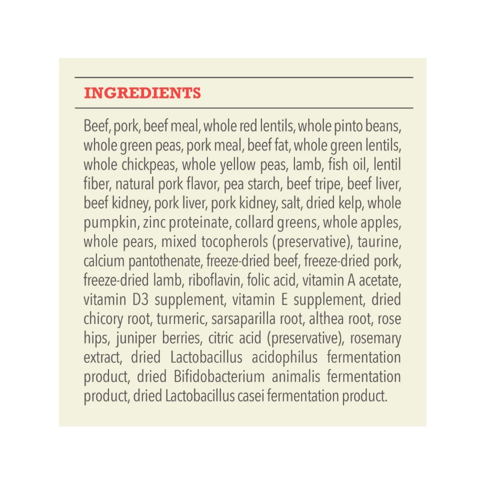 Beef, Deboned Pork, Beef Meal, Whole Red Lentils, Whole Pinto Beans, Whole Green Peas, Pork Meal, Beef Fat, Whole Green Lentils, Whole Chickpeas, Whole Yellow Peas, Deboned Lamb, Fish Oil, Lentil Fiber, Natural Pork Flavor, Pea Starch, Beef Tripe, Beef Liver, Beef Kidney, Pork Liver, Pork Kidney, Salt, Dried Kelp, Whole Pumpkin, Zinc Proteinate, Collard Greens, Whole Apples, Whole Pears, Mixed Tocopherols (Preservative), Taurine, Calcium Pantothenate, Freeze-Dried Beef Liver, Freeze-Dried Pork Liver, Freeze-Dried Lamb Liver, Riboflavin, Folic Acid, Vitamin A Acetate, Vitamin D3 Supplement, Vitamin E Supplement, Dried Chicory Root, Turmeric, Sarsaparilla, Althea Root, Rose Hips, Juniper Berries, Citric Acid (Preservative), Rosemary Extract, Dried Lactobacillus Acidophilus Fermentation Product, Dried Bifidobacterium Animalis Fermentation Product, Dried Lactobacillus Casei Fermentation Product.
