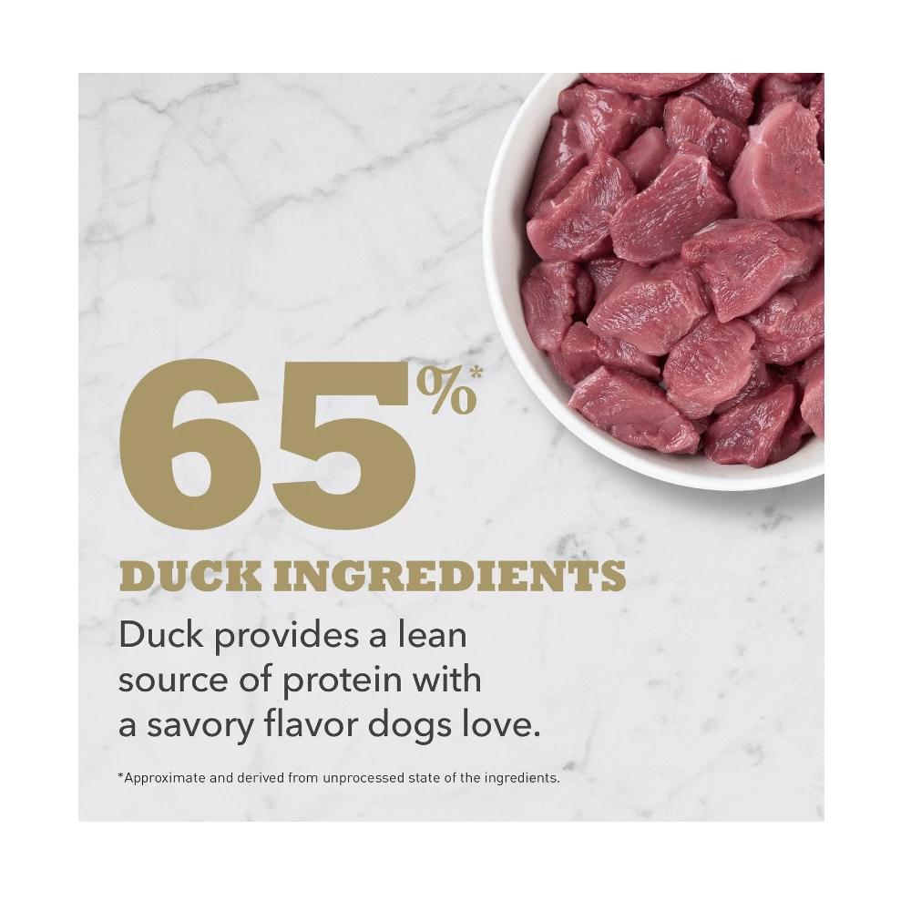 Deboned Duck, Duck Meal, Duck Liver, Sweet Potato, Whole Chickpeas, Duck Fat, Whole Lentils, Lentil Fiber, Pollock Oil, Whole Pears, Natural Duck Flavor, Duck Cartilage, Whole Pumpkin, Whole Cranberries, Salt, Choline Chloride, Taurine, Vitamin E Supplement, Dried Kelp, Zinc Proteinate, Mixed Tocopherols (Preservative), Freeze-Dried Duck Liver, Niacin, Thiamine Mononitrate, Riboflavin, Calcium Pantothenate, Pyridoxine Hydrochloride, Folic Acid, Vitamin B12 Supplement, Copper Proteinate, Vitamin A Acetate, Vitamin D3 Supplement, Turmeric, Citric Acid (Preservative), Rosemary Extract, Dried Lactobacillus Acidophilus Fermentation Product, Dried Bifidobacterium Animalis Fermentation Product, Dried Lactobacillus Casei Fermentation Product.