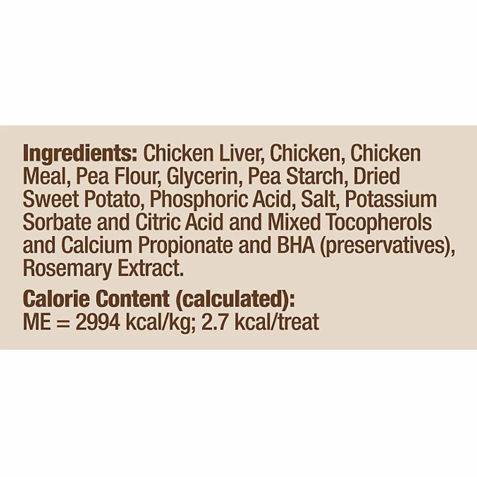 Chicken Liver, Chicken, Chicken Meal, Pea Flour, Glycerin, Pea Starch, Dried Sweet Potato, Phosphoric Acid, Salt, Potassium Sorbate and Citric Acid and Mixed Tocopherols and Calcium Propionate and BHA (Preservatives), Rosemary Extract.