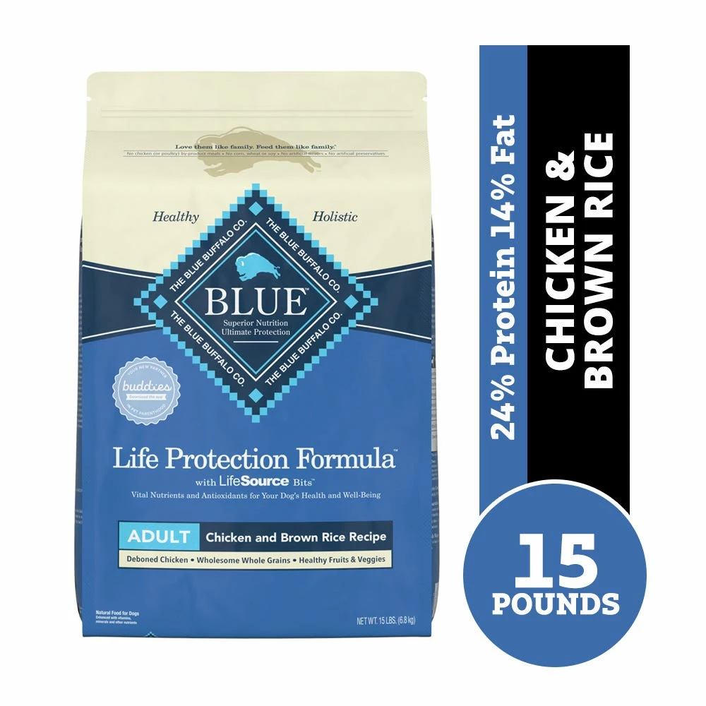 Blue Buffalo Life Protection Formula was created for the holistic health and well-being of adult dogs. All formulas start with real meat, whole grains, garden veggies and fruit, plus added LifeSource Bits, a precise blend of nutrients that have been enhanced with a Super 7 package of antioxidant-rich ingredients. This Adult Chicken & Brown Rice Recipe features delicious, protein-rich deboned chicken and other natural ingredients for a healthy meal your dog will love.