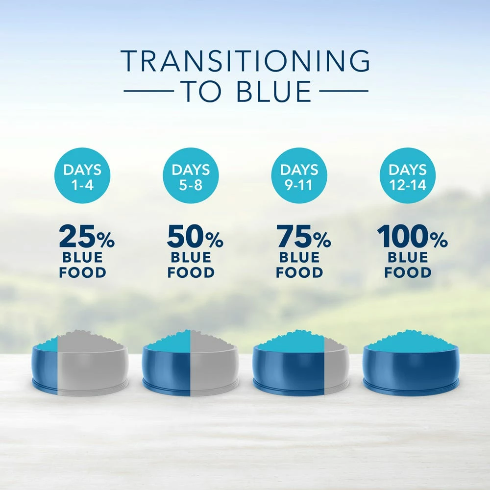 Start by mixing 25% of BLUE with your dog’s old food, and gradually increase the proportion of BLUE over the next 14 days.