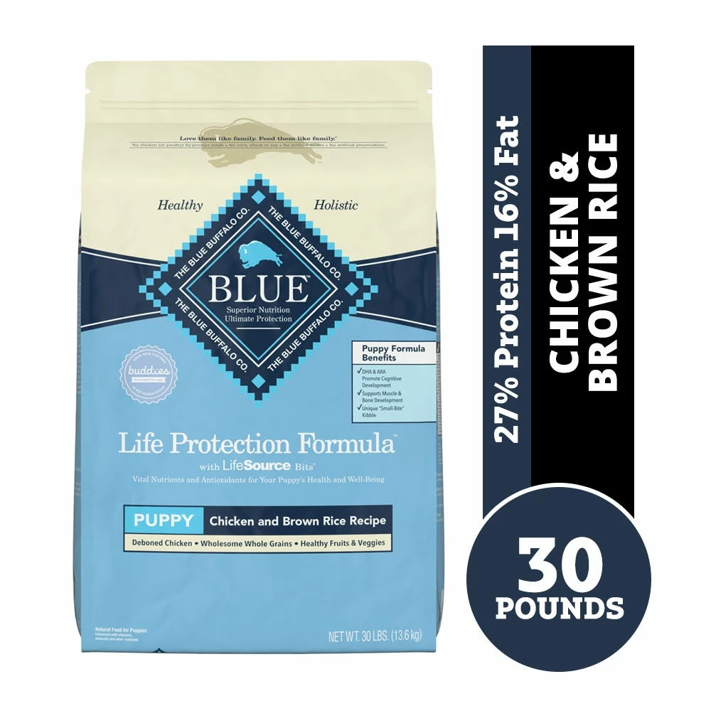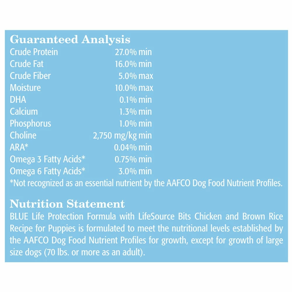 BLUE Life Protection Formula Chicken and Brown Rice Recipe Food for Puppies is formulated to meet the nutritional levels established by the AAFCO Dog Food Nutrient Profiles for growth.