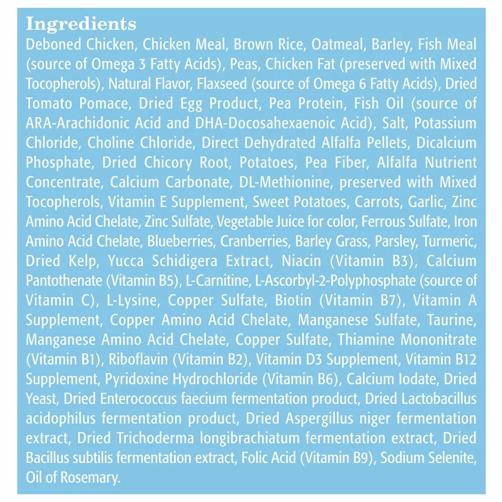 Deboned Chicken, Chicken Meal, Brown Rice, Oatmeal, Barley, Menhaden Fish Meal (source of Omega 3 Fatty Acids), Peas, Chicken Fat (preserved with Mixed Tocopherols), Flaxseed (source of Omega 6 Fatty Acids), Natural Flavor, Dried Tomato Pomace, Dried Egg Product, Pea Protein, Fish Oil (source of ARA-Arachidonic Acid and DHA-Docosahexaenoic Acid), Salt, Potassium Chloride, Choline Chloride, Dehydrated Alfalfa Meal, Dicalcium Phosphate, Potatoes, Dried Chicory Root, Pea Fiber, Alfalfa Nutrient Concentrate, Calcium Carbonate, DL-Methionine, preserved with Mixed Tocopherols, Vitamin E Supplement, Sweet Potatoes, Carrots, Garlic, Zinc Amino Acid Chelate, Zinc Sulfate, Vegetable juice for color, Ferrous Sulfate, Iron Amino Acid Chelate, Blueberries, Cranberries, Barley Grass, Parsley, Turmeric, Dried Kelp, Yucca Schidigera Extract, Niacin (Vitamin B3), Calcium Pantothenate (Vitamin B5), L-Carnitine, L-Ascorbyl-2-Polyphosphate (source of Vitamin C), L-Lysine, Copper Sulfate, Biotin (Vitamin B7), Vitamin A Supplement, Copper Amino Acid Chelate, Manganese Sulfate, Taurine, Manganese Amino Acid Chelate, Thiamine Mononitrate (Vitamin B1), Riboflavin (Vitamin B2) Vitamin D3 Supplement, Vitamin B12 Supplement, Pyridoxine Hydrochloride (Vitamin B6), Calcium Iodate, Dried Yeast, Dried Enterococcus faecium fermentation product, Dried Lactobacillus acidophilus fermentation product, Dried Aspergillus niger fermentation extract, Dried Trichoderma longibrachiatum fermentation extract, Dried Bacillus subtilis fermentation extract, Folic Acid (Vitamin B9), Sodium Selenite, Oil of Rosemary.