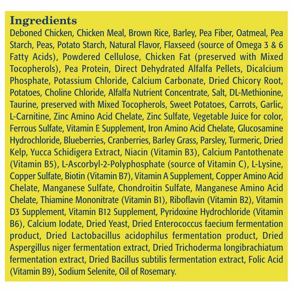 Deboned Chicken, Chicken Meal, Brown Rice, Barley, Pea Fiber, Pea Starch, Oatmeal, Peas, Potato Starch, Natural Flavor, Flaxseed (source of Omega 3 and 6 Fatty Acids), Powdered Cellulose, Chicken Fat (preserved with Mixed Tocopherols), Pea Protein, Dehydrated Alfalfa Meal, Dicalcium Phosphate, Potassium Chloride, Potatoes, Calcium Carbonate, Dried Chicory Root, Choline Chloride, Alfalfa Nutrient Concentrate, Salt, DL-Methionine, preserved with Mixed Tocopherols, Sweet Potatoes, Carrots, Garlic, L-Carnitine, Zinc Amino Acid Chelate, Zinc Sulfate, Vegetable Juice for color, Ferrous Sulfate, Vitamin E Supplement, Iron Amino Acid Chelate, Glucosamine Hydrochloride, Blueberries, Cranberries, Barley Grass, Parsley, Turmeric, Dried Kelp, Yucca Schidigera Extract, Niacin (Vitamin B3), Calcium Pantothenate (Vitamin B5), L-Ascorbyl-2-Polyphosphate (source of Vitamin C), L-Lysine, Copper Sulfate, Biotin (Vitamin B7), Vitamin A Supplement, Copper Amino Acid Chelate, Manganese Sulfate, Taurine, Chondroitin Sulfate, Manganese Amino Acid Chelate, Thiamine Mononitrate (Vitamin B1), Riboflavin (Vitamin B2), Vitamin D3 Supplement, Vitamin B12 Supplement, Pyridoxine Hydrochloride (Vitamin B6), Calcium Iodate, Dried Yeast, Dried Enterococcus faecium fermentation product, Dried Lactobacillus acidophilus fermentation product, Dried Aspergillus niger fermentation extract, Dried Trichoderma longibrachiatum fermentation extract, Dried Bacillus subtilis fermentation extract, Folic Acid (Vitamin B9), Sodium Selenite, Oil of Rosemary.