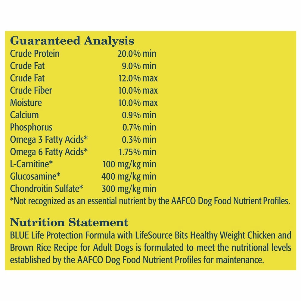 BLUE Life Protection Formula Chicken and Brown Rice Recipe Healthy Weight Food for Adult Dogs is formulated to meet the nutritional levels established by the AAFCO Dog Food Nutrient Profiles for maintenance.