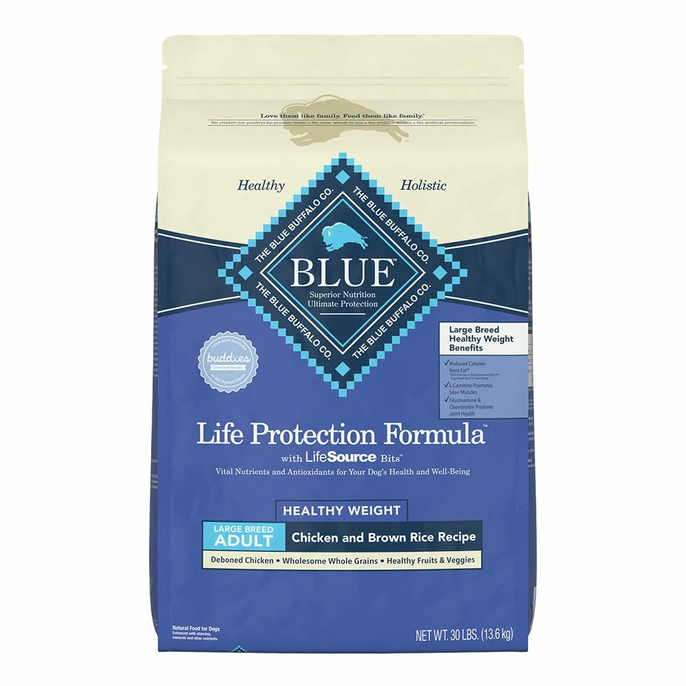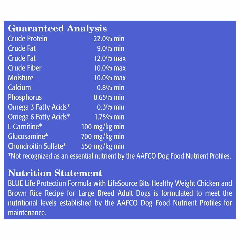 BLUE Life Protection Formula Chicken and Brown Rice Recipe Healthy Weight Food for Large Breed Adult Dogs is formulated to meet the nutritional levels established by the AAFCO Dog Food Nutrient Profiles for maintenance.