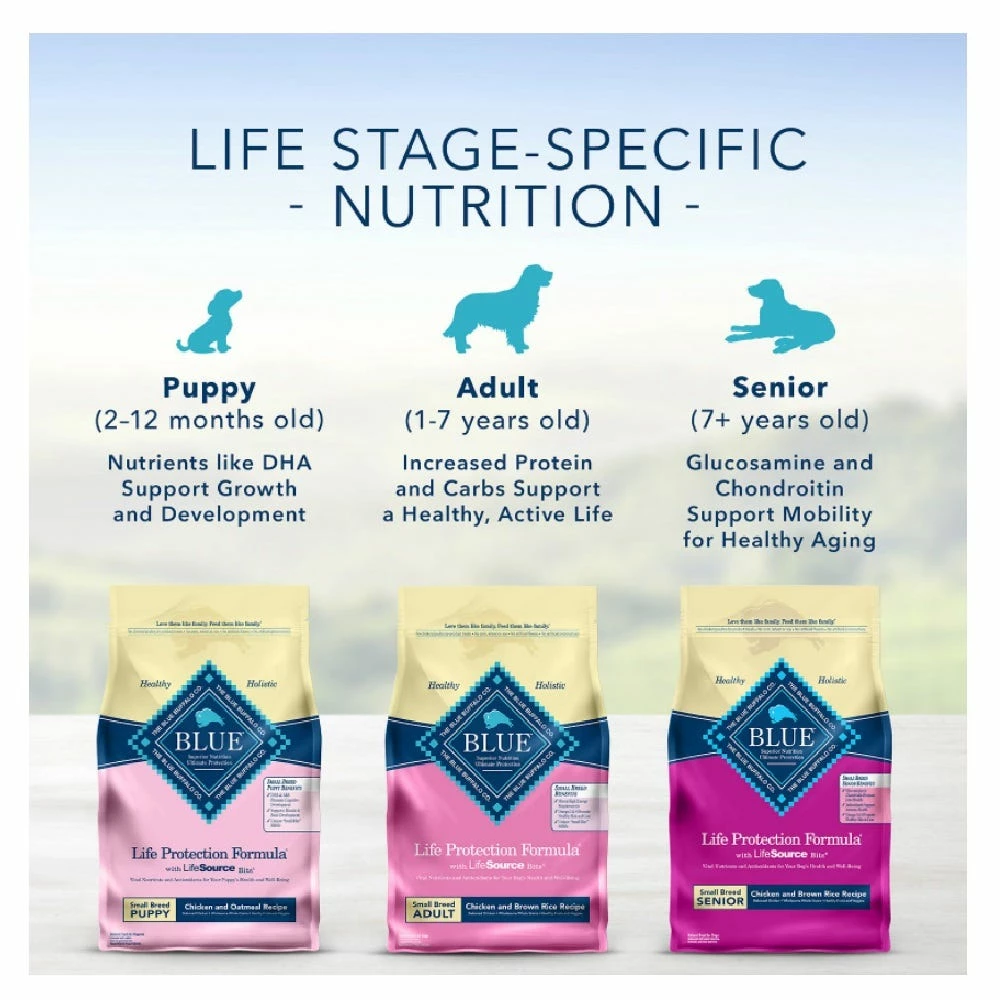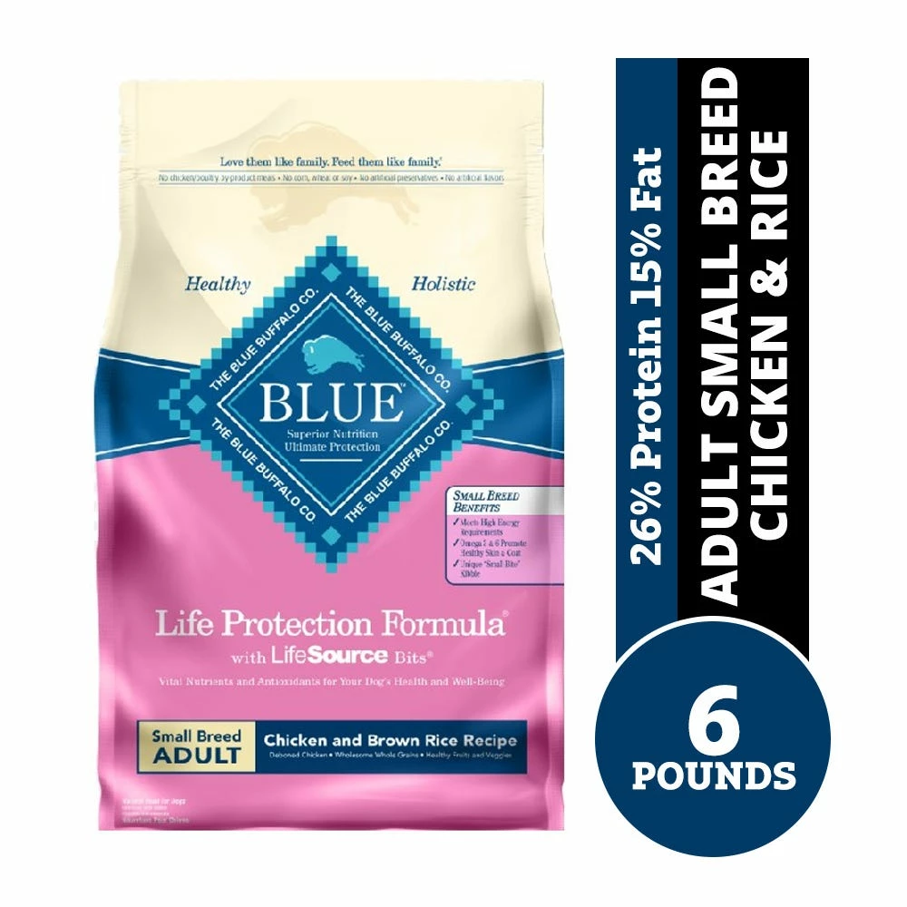 Blue Buffalo Life Protection Formula was created for the health and well-being of dogs. All formulas start with real meat, whole grains, garden veggies and fruit, plus added LifeSource Bits, a precise blend of nutrients that have been enhanced with a Super 7 package of antioxidant-rich ingredients. This Small Breed Adult Chicken & Brown Rice Recipe features delicious, protein-rich deboned chicken and is made with increased protein and carbohydrates to meet higher energy needs of smaller dogs.