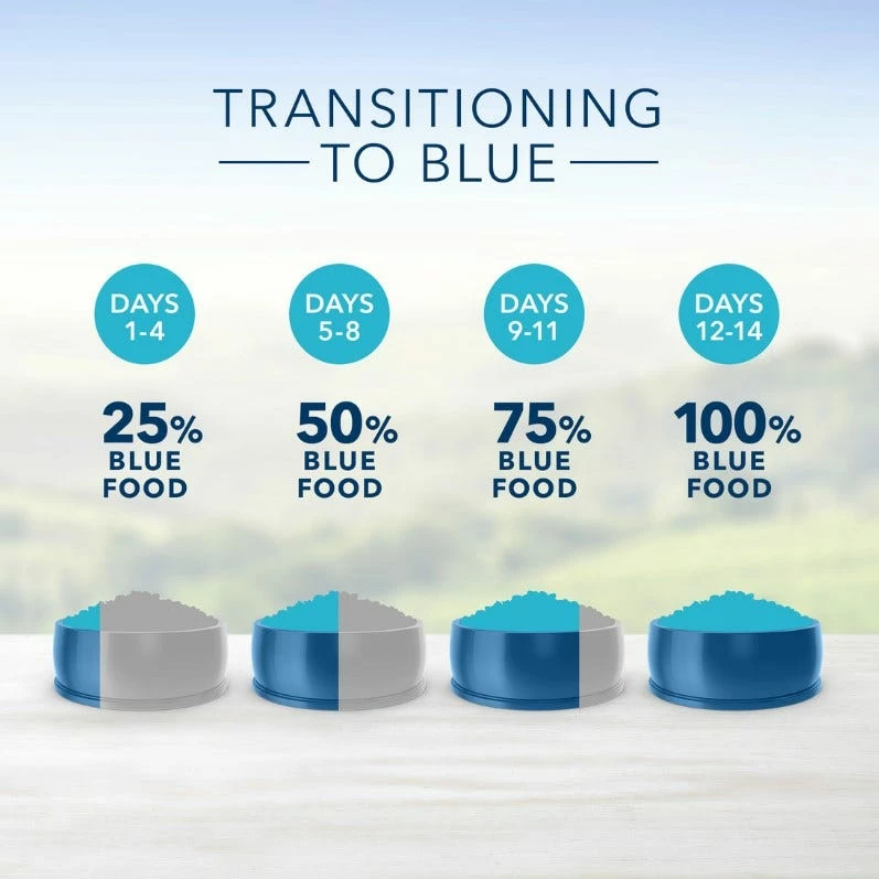 Start by mixing 25% of BLUE with your dog’s old food, and gradually increase the proportion of BLUE over the next 14 days.