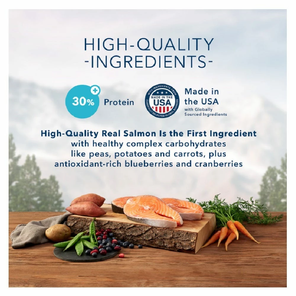Deboned Salmon, Chicken Meal, Pea Protein, Peas, Tapioca Starch, Pea Starch, Dried Tomato Pomace, Dried Egg Product, Flaxseed (source of Omega 6 Fatty Acids), Natural Flavor, Chicken Fat (preserved with Mixed Tocopherols), Fish Meal (source of Omega 3 Fatty Acids), Potatoes, Fish Oil (source of EPA- Eicosapentaenoic acid), Dicalcium Phosphate, Direct Dehydrated Alfalfa Pellets, DL-Methionine, Potassium Chloride, Pea Fiber, Alfalfa Nutrient Concentrate, Dried Chicory Root, Calcium Carbonate, Salt, Taurine, Choline Chloride, preserved with Mixed Tocopherols, Sweet Potatoes, Carrots, Glucosamine Hydrochloride, Vitamin E Supplement, L-Carnitine, Zinc Amino Acid Chelate, Zinc Sulfate, Vegetable Juice for color, Ferrous Sulfate, Iron Amino Acid Chelate, Blueberries, Cranberries, Barley Grass, Parsley, Turmeric, Dried Kelp, Yucca Schidigera Extract, Chondroitin Sulfate, Niacin (Vitamin B3), Calcium Pantothenate (Vitamin B5), L-Ascorbyl-2-Polyphosphate (source of Vitamin C), L-Lysine, Copper Sulfate, Biotin (Vitamin B7), Vitamin A Supplement, Copper Amino Acid Chelate, Manganese Sulfate, Manganese Amino Acid Chelate, Thiamine Mononitrate (Vitamin B1), Riboflavin (Vitamin B2), Vitamin D3 Supplement, Vitamin B12 Supplement, Pyridoxine Hydrochloride (Vitamin B6), Calcium Iodate, Dried Yeast, Dried Enterococcus faecium fermentation product, Dried Lactobacillus acidophilus fermentation product, Dried Aspergillus niger fermentation extract, Dried Trichoderma longibrachiatum fermentation extract, Dried Bacillus subtilis fermentation extract, Folic Acid (Vitamin B9), Sodium Selenite, Oil of Rosemary.