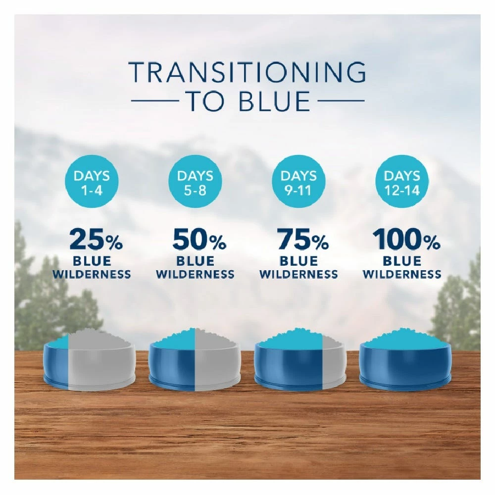 Start by mixing 25% of BLUE with your dog’s old food, and gradually increase the proportion of BLUE over the next 14 days.