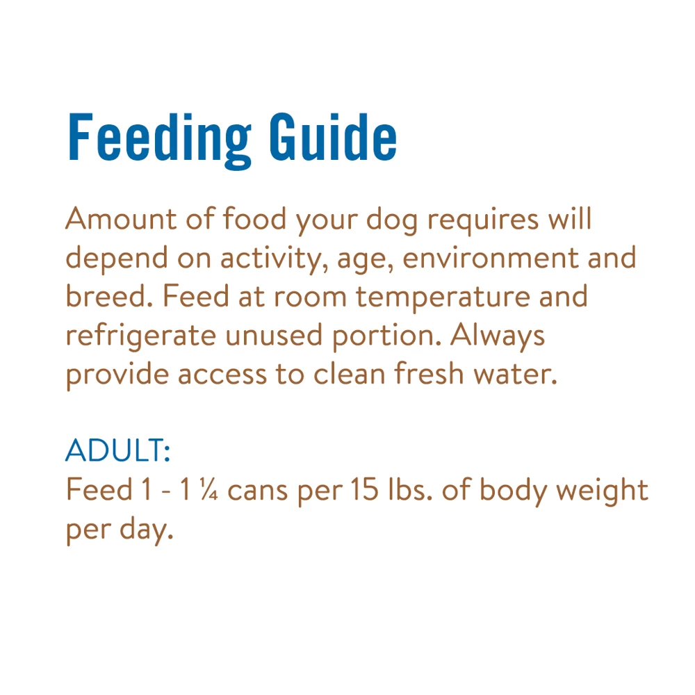 Feed 1 – 1 1/2 cans per 15 lbs of body weight per day. Remember to keep plenty of fresh water available at all times.