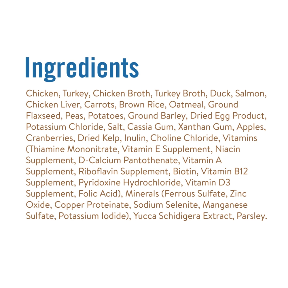 Chicken, Turkey, Chicken Broth, Turkey Broth, Duck, Salmon, Chicken Liver, Carrots, Brown Rice, Oatmeal, Ground Flaxseed, Peas, Potatoes, Ground Barley, Dried Egg Product, Potassium Chloride, Salt, Cassia Gum, Xanthan Gum, Apples, Cranberries, Dried Kelp, Inulin, Choline Chloride, Vitamins (Thiamine Mononitrate, Vitamin E Supplement, Niacin Supplement, D-Calcium Pantothenate, Vitamin A Supplement, Riboflavin Supplement, Biotin, Vitamin B12 Supplement, Pyridoxine Hydrochloride, Vitamin D3 Supplement, Folic Acid), Minerals (Ferrous Sulfate, Zinc Oxide, Copper Proteinate, Sodium Selenite, Manganese Sulfate, Potassium Iodide), Yucca Schidigera Extract, Parsley.
