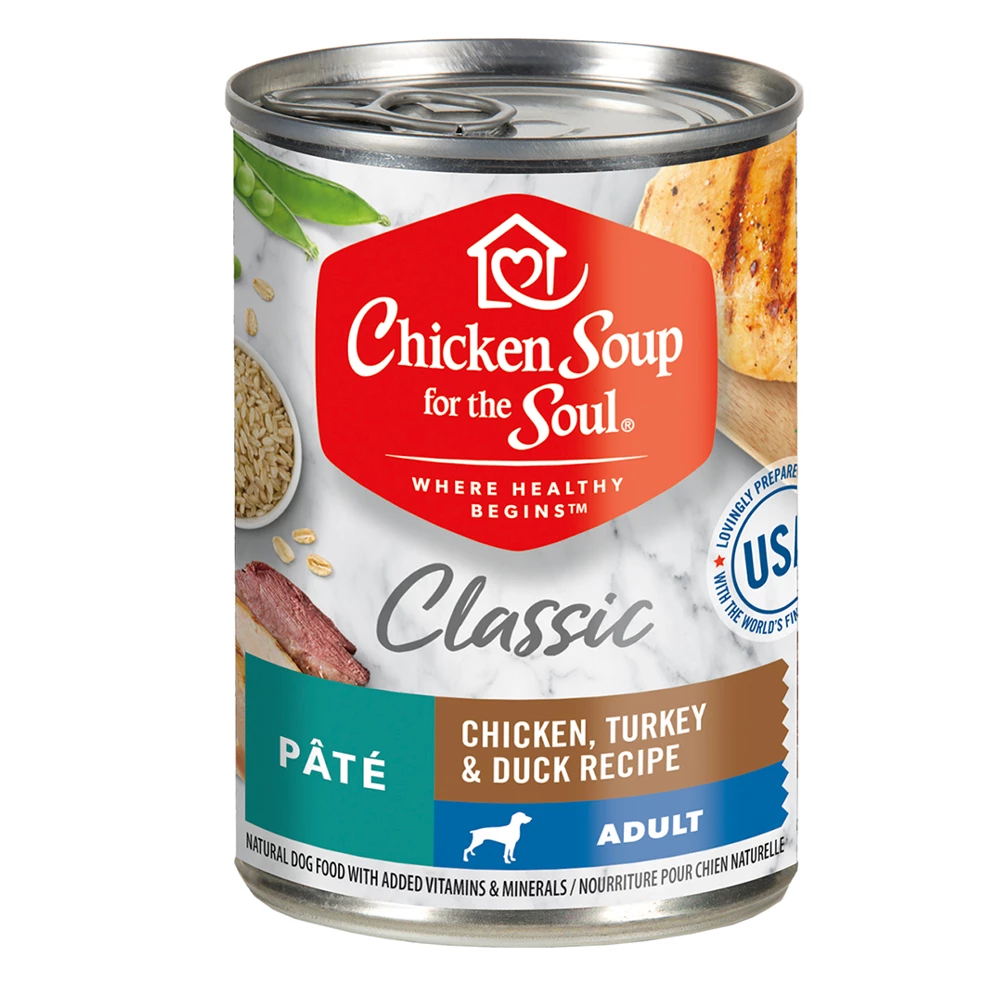 Give your older pup everything he needs to keep him feeling his best with Chicken Soup for the Soul Adult Canned Dog Food. This diet contains real chicken and turkey as the first two ingredients to maintain lean muscles. It is also blended with duck and salmon making for a taste your furry friend will love. With no by-product meals, wheat, corn or soy, Chicken Soup for the Soul Adult Canned Dog Food is a complete and balanced option for your paw-tner.