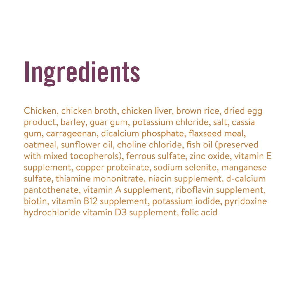 Chicken, Chicken Broth, Chicken Liver, Brown Rice, Dried Egg Product, Barley, Guar Gum, Potassium Chloride, Salt, Cassia Gum, Carrageenan, Dicalcium Phosphate, Flaxseed Meal, Oatmeal, Sunflower Oil, Choline Chloride, Fish Oil (Preserved With Mixed Tocopherols), Ferrous Sulfate, Zinc Oxide, Vitamin E Supplement, Copper Proteinate, Sodium Selenite, Manganese Sulfate, Thiamine Mononitrate, Niacin Supplement, D-Calcium Pantothenate, Vitamin A Supplement, Riboflavin Supplement, Biotin, Vitamin B12 Supplement, Potassium Iodide, Pyridoxine Hydrochloride Vitamin D3 Supplement, Folic Acid.