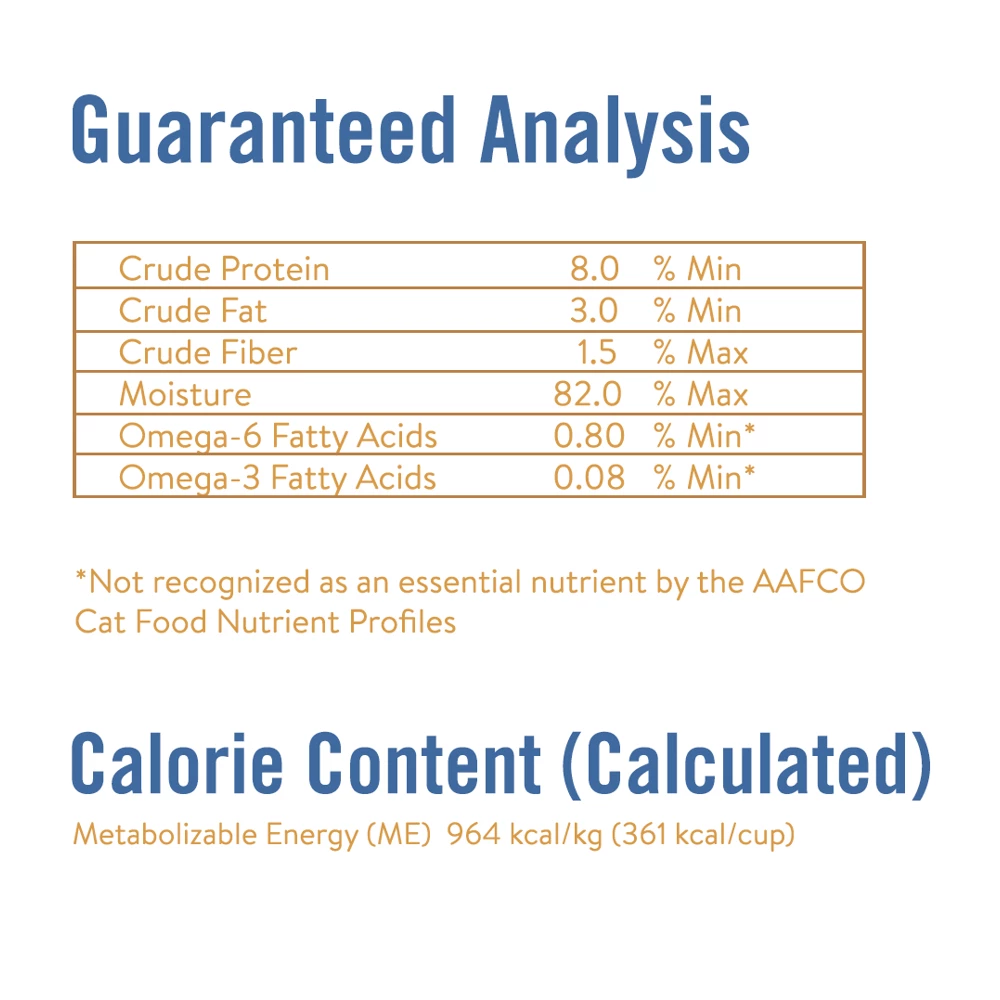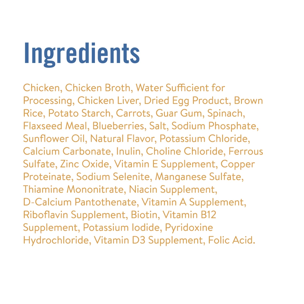Chicken, Chicken Broth, Water Sufficient For Processing, Chicken Liver, Dried Egg Product, Brown Rice, Potato Starch, Carrots, Guar Gum, Spinach, Flaxseed Meal, Blueberries, Salt, Sodium Phosphate, Sunflower Oil, Natural Flavor, Potassium Chloride, Calcium Carbonate, Inulin, Choline Chloride, Ferrous Sulfate, Zinc Oxide, Vitamin E Supplement, Copper Proteinate, Sodium Selenite, Manganese Sulfate, Thiamine Mononitrate, Niacin Supplement, D-Calcium Pantothenate, Vitamin A Supplement, Riboflavin Supplement, Biotin, Vitamin B12 Supplement, Potassium Iodide, Pyridoxine Hydrochloride, Vitamin D3 Supplement, Folic Acid.
