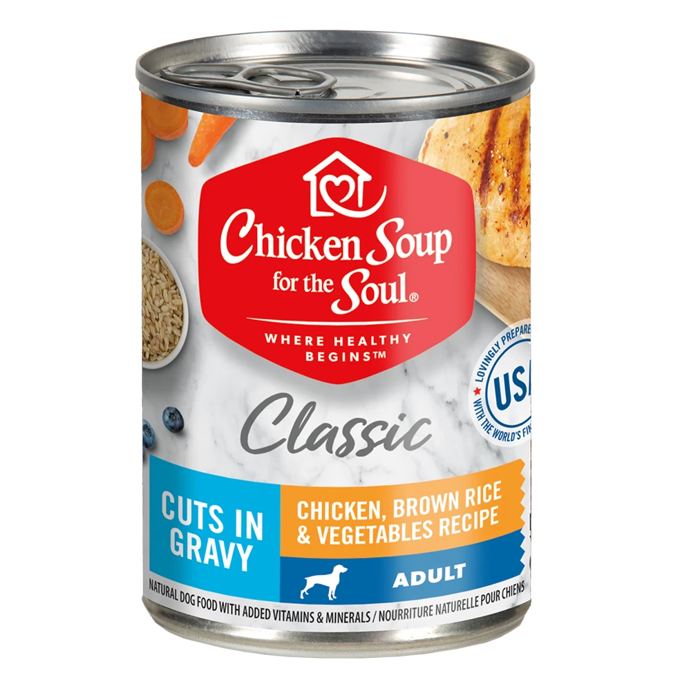 Chicken Soup Classic Cuts in Gravy Chicken, Brown Rice, and Vegetables Recipe includes real, recognizable ingredients, so you know just what you’re feeding your dog. Real chicken is the first ingredient for paw-some flavor and the high-quality protein your pup needs to help maintain lean muscles. This USA-prepared adult dog food is also made without artificial colors, preservatives or flavors, because your dog’s food should be as real as the bond that you share!