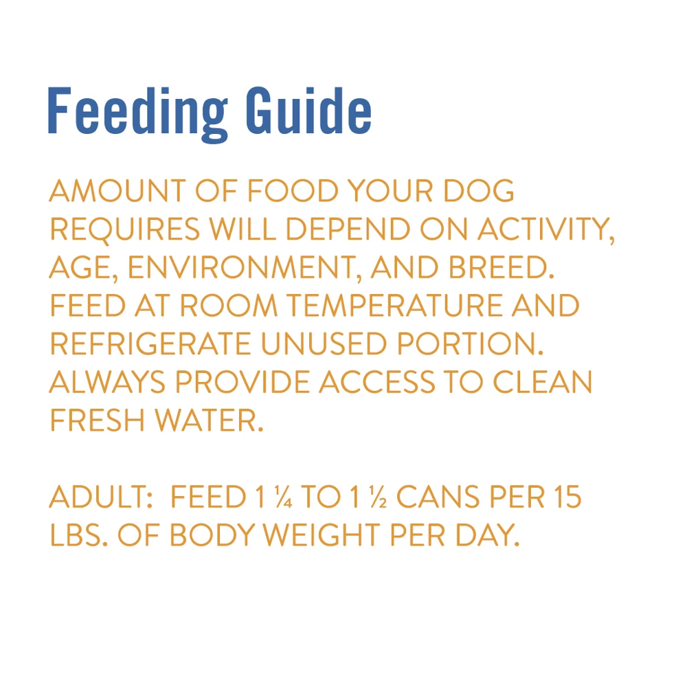 Amount of food your dog requires will depend on activity, age, environment, and breed. Feed at room temperature and refrigerate unused portion. Always provide access to clean fresh water. Adult: Feed 1 1/4 to 1 1/2 cans per 15-lbs. of body weight per day.