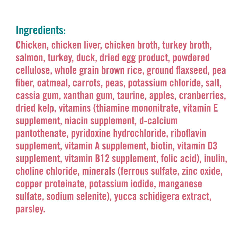 Chicken, Chicken Liver, Chicken Broth, Turkey Broth, Salmon, Turkey, Duck, Dried Egg Product, Powdered Cellulose, Whole Grain Brown Rice, Flaxseed, Pea Fiber, Oatmeal, Carrots, Peas, Potassium Chloride, Salt, Cassia Gum, Xanthan Gum, Taurine, Apples, Cranberries, Dried Kelp, Vitamins (Thiamine Mononitrate, Vitamin E Supplement, Niacin Supplement, D-Calcium Pantothenate, Pyridoxine Hydrochloride, Riboflavin Supplement, Vitamin A Supplement, Biotin, Vitamin D3 Supplement, Vitamin B12 Supplement, Folic Acid), Inulin, Choline Chloride, Minerals (Ferrous Sulfate, Zinc Oxide, Copper Proteinate, Potassium Iodide, Manganese Sulfate, Sodium Selenite), Yucca Schidigera Extract, Parsley.
