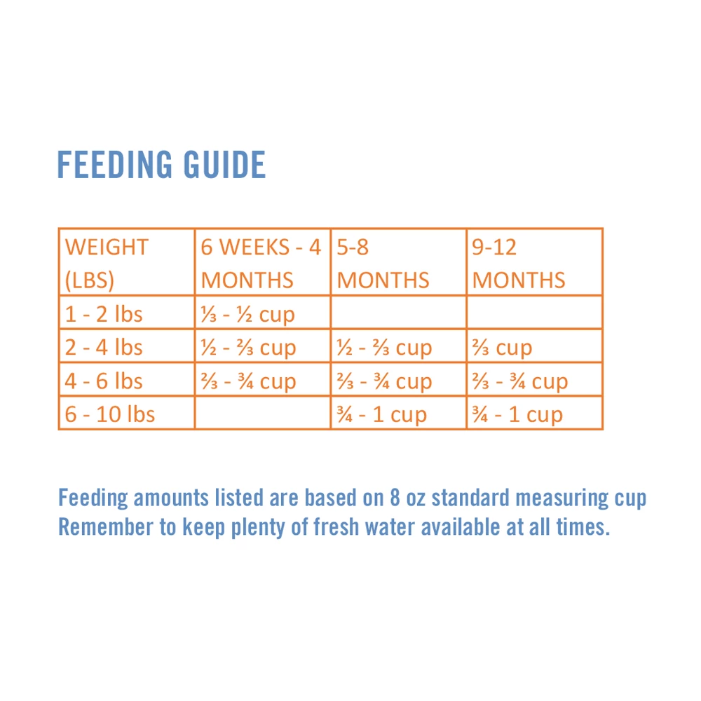 For kittens weighing 1-2 pounds, feed 1/3-1/2 cup daily if they are 6 weeks-4 months old. For kittens weighing 2-4 pounds, feed 1/2 to 2/3 cups daily if they are 6 weeks-4 months, 1/2 to 2/3 cups if they are 5-8 months and 2/3 cups daily if they are 9-12 months old. For kittens weighing 4-6 pounds, feed 2/3 to 3/4 cups daily. For kittens weighing 6-10 pounds, feed them 3/4 to 1 cup daily if they are 5-8 months and 3/4 to 1 cup if they are 9-12 months old. Feeding amounts are listed based on 8 oz standard measuring cup; individual kitten’s requirements may vary due to age, breed, environment and activity level. Remember to keep plenty of fresh waster available at all times.