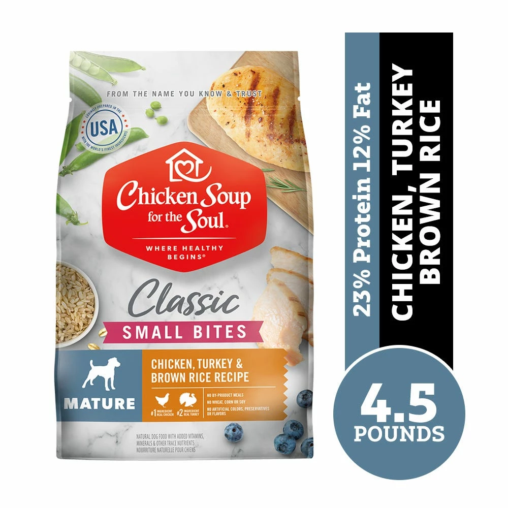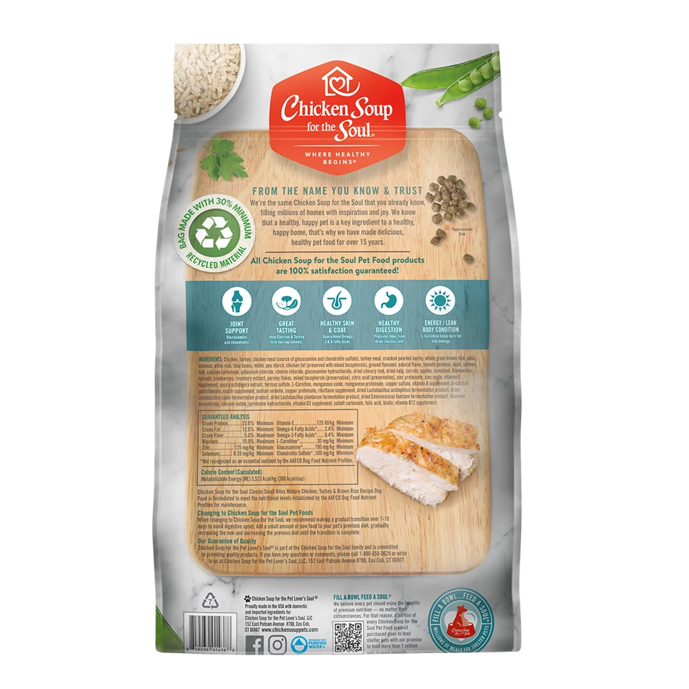 If you’ve got a distinguished older pup in your life, then you know how special they are—and special dogs deserve a special diet like Chicken Soup for the Soul Small Bites Chicken, Turkey & Brown Rice Recipe Senior Dry Dog Food. You can help your pup maintain a healthy, long life with this kibble, in which real chicken is the first ingredient. Additionally, omega 3 and 6 fatty acids promote healthy skin and coat while L-carnitine helps turn fat into energy. Healthy digestion is helped along by prebiotic fiber and a special blend of vitamins and minerals.