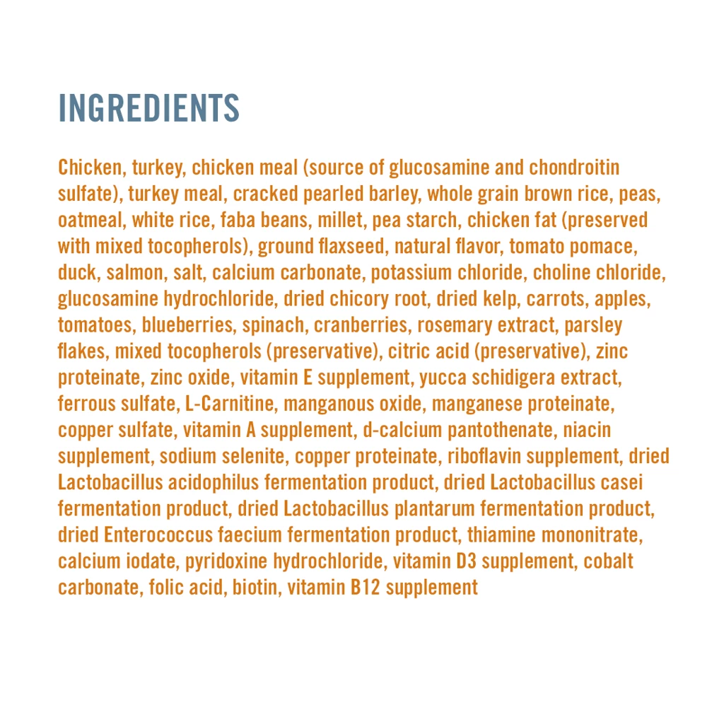 Chicken, Turkey, Chicken Meal (Natural Source Of Glucosamine And Chondroitin Sulfate), Turkey Meal, Cracked Pearled Barley, Whole Grain Brown Rice, Peas, Oatmeal, White Rice, Faba Beans, Millet, Pea Starch, Chicken Fat (Preserved With Mixed Tocopherols), Ground Flaxseed, Natural Flavor, Tomato Pomace, Duck, Salmon, Salt, Calcium Carbonate, Potassium Chloride, Choline Chloride, Glucosamine Hydrochloride, Dried Chicory Root, Dried Kelp, Carrots, Apples, Tomatoes, Blueberries, Spinach, Cranberries, Rosemary Extract, Parsley Flakes, Mixed Tocopherols (Preservative), Citric Acid (Preservative), Zinc Proteinate, Zinc Oxide, Vitamin E Supplement, Yucca Schidigera Extract, Ferrous Sulfate, L-Carnitine, Manganous Oxide, Manganese Proteinate, Copper Sulfate, Vitamin A Supplement, D-Calcium Pantothenate, Niacin Supplement, Sodium Selenite, Copper Proteinate, Riboflavin Supplement, Dried Lactobacillus Acidophilus Fermentation Product, Dried Lactobacillus Casei Fermentation Product, Dried Lactobacillus Plantarum Fermentation Product, Dried Enterococcus Faecium Fermentation Product, Thiamine Mononitrate, Calcium Iodate, Pyridoxine Hydrochloride, Vitamin D3 Supplement, Cobalt Carbonate, Folic Acid, Biotin, Vitamin B12 Supplement.