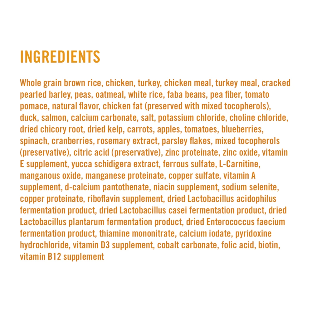 Whole Grain Brown Rice, Real Chicken, Turkey, Chicken Meal, Turkey Meal, Cracked Pearled Barley, Peas, Oatmeal, White Rice, Faba Beans, Pea Fiber, Tomato Pomace, Natural Flavor, Chicken Fat (Preserved With Mixed Tocopherols), Duck, Salmon, Calcium Carbonate, Salt, Potassium Chloride, Choline Chloride, Dried Chicory Root, Dried Kelp, Carrots, Apples, Tomatoes, Blueberries, Spinach, Cranberries, Rosemary Extract, Parsley Flakes, Mixed Tocopherols (Preservative), Citric Acid (Preservative), Zinc Proteinate, Zinc Oxide, Vitamin E Supplement, Yucca Schidigera Extract, Ferrous Sulfate, L-Carnitine, Manganous Oxide, Manganese Proteinate, Copper Sulfate, Vitamin A Supplement, D-Calcium Pantothenate, Niacin Supplement, Sodium Selenite, Copper Proteinate, Riboflavin Supplement, Dried Lactobacillus Acidophilus Fermentation Product, Dried Lactobacillus Casei Fermentation Product, Dried Lactobacillus Plantarum Fermentation Product, Dried Enterococcus Faecium Fermentation Product, Thiamine Mononitrate, Calcium Iodate, Pyridoxine Hydrochloride, Vitamin D3 Supplement, Cobalt Carbonate, Folic Acid, Biotin, Vitamin B12 Supplement.