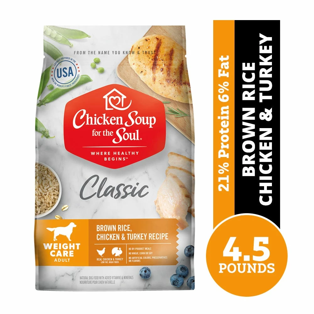 Give your older pup the support he needs with Chicken Soup for the Soul Adult Weight Care Dry Dog Food. This diet is high in fiber and low in fat to assist healthy body condition while L- carnitine helps turn fat into energy. It contains real chicken as the first ingredient with antioxidants and superfoods like apples, blueberries and spinach help build immune health. This food also aids healthy digestion with prebiotic fiber from dried chicory root and omega 3 and 6 fatty acids to promote healthy skin and coat. With no by-product meals, wheat, corn or soy, Chicken Soup for the Soul Adult Weight Care Dry Dog Food will keep your paw-tner looking and feeling good