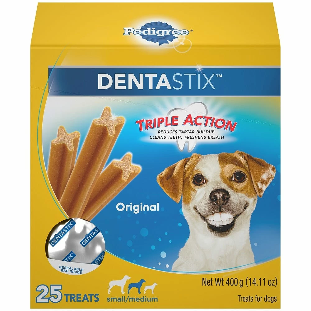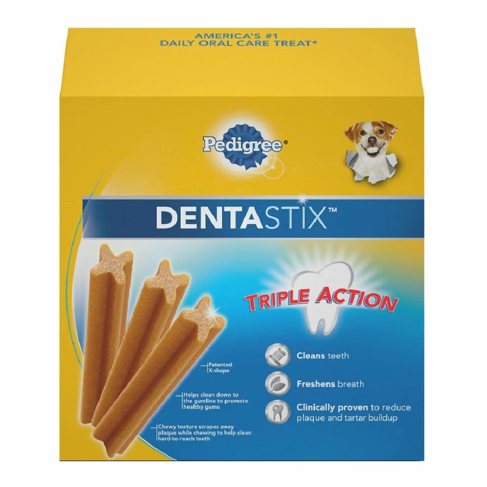 Treat your dog to Pedigree Dentastix Small/Medium Dental Treats for dogs, the perfect snack that adds a delicious chicken flavored boost to your dog’s oral care routine. Formulated for small and medium dogs, the chewy texture and unique X-shape design in these healthy dog treats is clinically proven to reduce plaque and tartar buildup, so treat time is part of a healthy dental care routine that helps promote canine oral health too!