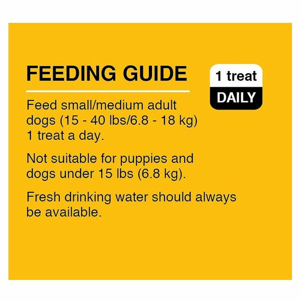 Feed small/medium Adult dogs (15 – 40 lbs.) 1 treat a day. Not suitable for puppies and dogs under 15 lbs. Fresh drinking water should always be available.