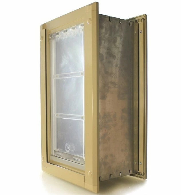 Endura Flap Pet Doors for Walls are manufactured in the USA to be flexible, safe, and energy efficient in all climates. The translucent, dual-pane flap seals tightly against the weather using a patented system of magnets. This is a good choice for cats and timid dogs since it only has one flap on the inside frame and remains energy efficient. When closed, the flap reduces air conditioning and heat loss and withstands winds up to 50 mph. Each unit permanently installs into your wall, up to eight (8) inches thick and includes a locking security panel. Comes with: Interior frame with flap and exterior frame, aluminum wall tunnel, security panel, mounting hardware and installation instructions. The are available in three colors: White, Black and Tan. 15 year warranty!