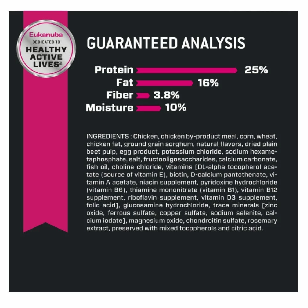 Chicken, Chicken By-Product Meal, Corn, Wheat, Chicken Fat, Ground Grain Sorghum, Natural Flavors, Dried Plain Beet Pulp, Egg Product, Potassium Chloride, Sodium Hexametaphosphate, Salt, Fructooligosaccharides, Calcium Carbonate, Fish Oil, Choline Chloride, Vitamins [Dl-Alpha Tocopherol Acetate (Source Of Vitamin E), Biotin, D-Calcium Pantothenate, Vitamin A Acetate, Niacin Supplement, Pyridoxine Hydrochloride (Vitamin B6), Thiamine Mononitrate (Vitamin B1), Vitamin B12 Supplement, Riboflavin Supplement, Vitamin D3 Supplement, Folic Acid], Glucosamine Hydrochloride, Trace Minerals [Zinc Oxide, Ferrous Sulfate, Copper Sulfate, Sodium Selenite, Calcium Iodate], Magnesium Oxide, Rosemary Extract, Preserved With Mixed Tocopherols And Citric Acid.