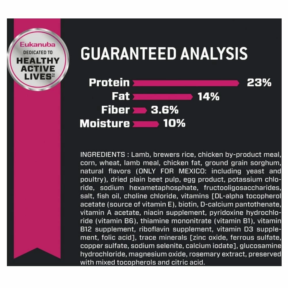 Lamb, Brewers Rice, Chicken By-Product Meal, Corn, Wheat, Lamb Meal, Chicken Fat, Ground Grain Sorghum, Natural Flavors, Dried Plain Beet Pulp, Egg Product, Potassium Chloride, Sodium Hexametaphosphate, Fructooligosaccharides, Salt, Fish Oil, Choline Chloride, Vitamins [Dl-Alpha Tocopherol Acetate (Source Of Vitamin E), Biotin, D-Calcium Pantothenate, Vitamin A Acetate, Niacin Supplement, Pyridoxine Hydrochloride (Vitamin B6), Thiamine Mononitrate (Vitamin B1), Vitamin B12 Supplement, Riboflavin Supplement, Vitamin D3 Supplement, Folic Acid], Trace Minerals [Zinc Oxide, Ferrous Sulfate, Copper Sulfate, Sodium Selenite, Calcium Iodate], Glucosamine Hydrochloride, Magnesium Oxide, Rosemary Extract, Preserved With Mixed Tocopherols And Citric Acid.