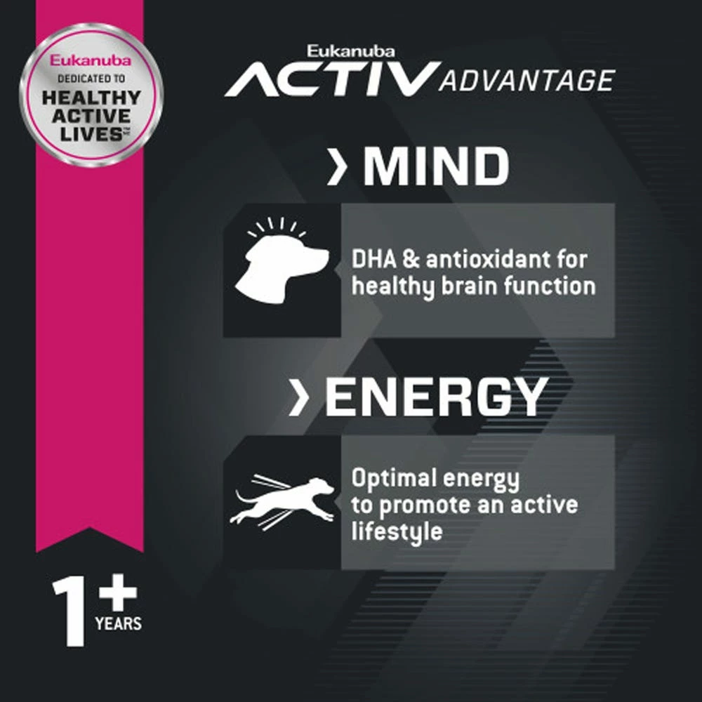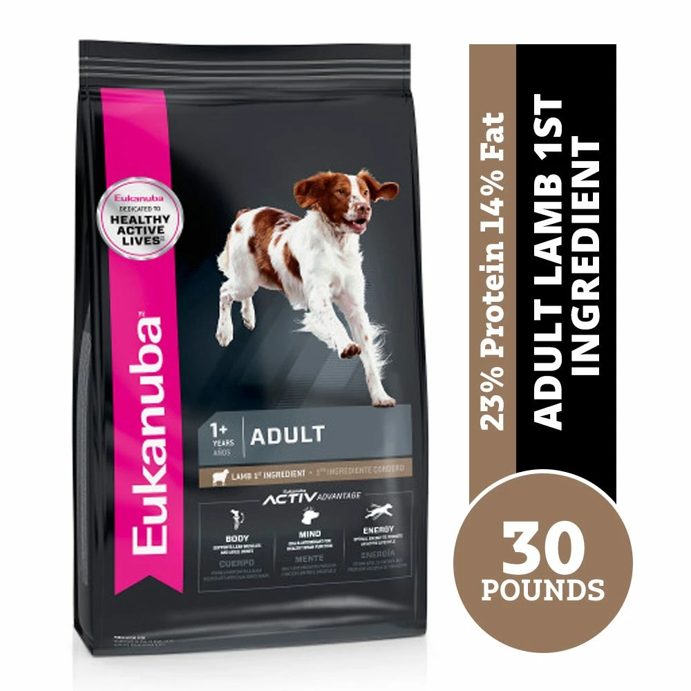 Your adult dog is anything but ordinary, and he requires extraordinary nutrition to perform his best. Feed your companion’s body, mind, and energy with Eukanuba Adult Lamb 1st Ingredient Dry Dog Food. Animal proteins, glucosamine, and chondroitin sulfate help keep muscles lean and joints limber and strong. DHA and vitamin E help support healthy brain function to help your adult dog stay sharp. The dry lamb dog food is formulated with optimal levels of fats and carbohydrates to help fuel an active lifestyle. 3D DentaDefense reduces tartar buildup for clean teeth and healthy gums. A natural fiber and prebiotic blend aids gentle digestion to help keep your dog feeling healthy. Plus, high-quality lamb is the first ingredient in this adult dry dog food to power your active dog’s day. Mix this kibble with your dog’s favorite wet food for the perfect complement. Your dog always puts his best paw forward for you. Return the favor by feeding him Eukanuba and discover the extraordinary in every day.