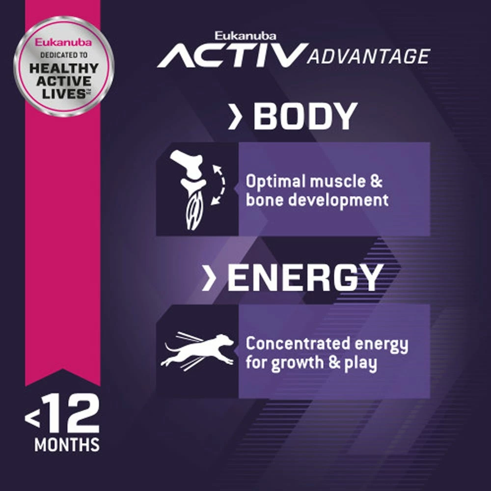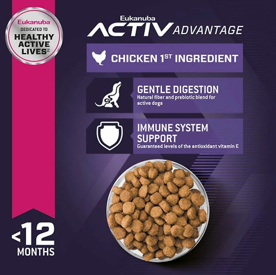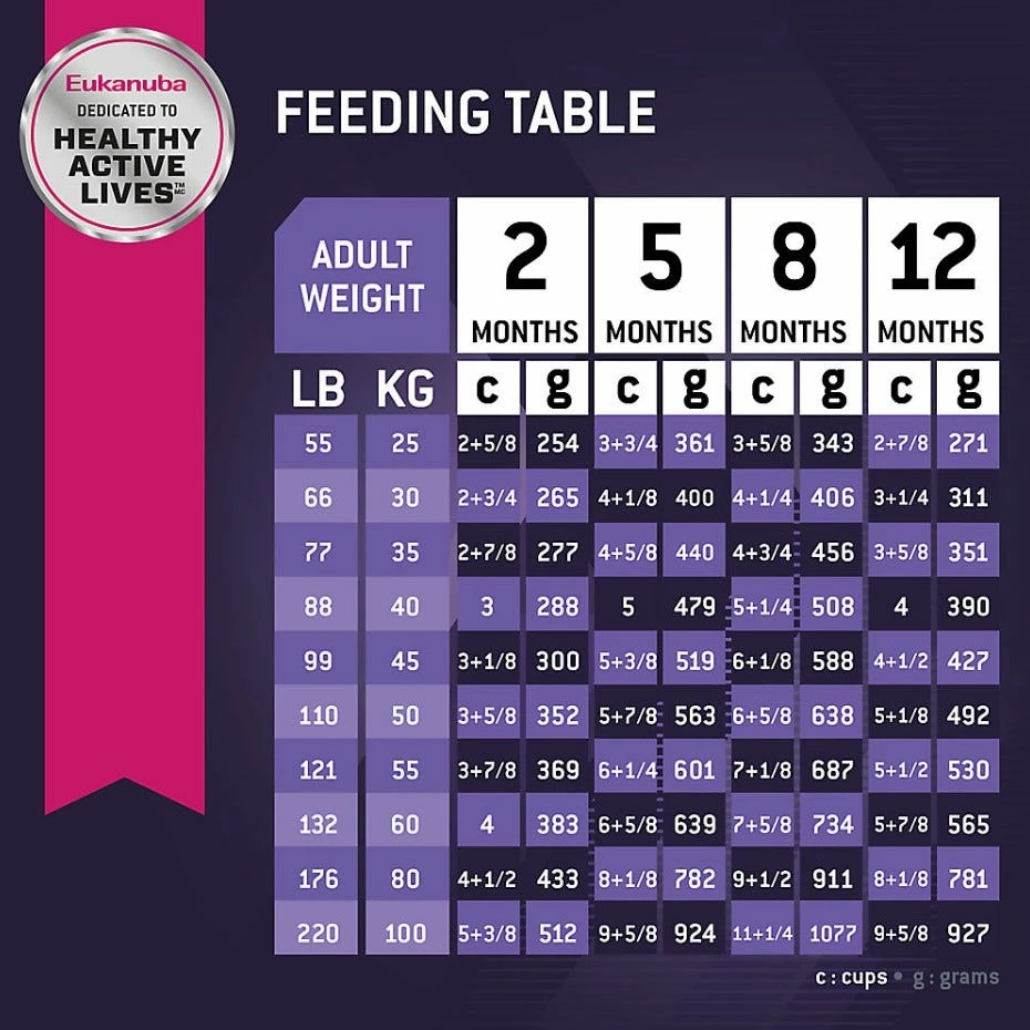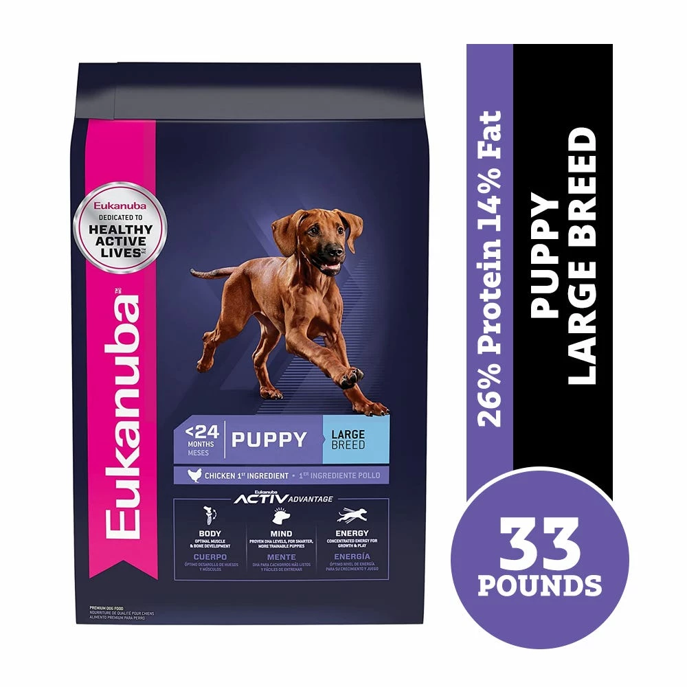 With his endless energy, determination, and smarts, it’s clear your large breed puppy is anything but ordinary. Unleash his extraordinary potential with Eukanuba Puppy Large Breed Dry Dog Food. This complete and balanced puppy food is made to fuel your growing companion’s body, mind, and energy. High-quality animal proteins and optimal levels of calcium and phosphorus help maintain muscle growth and bone health. DHA helps promote healthy brain development for a smarter, more trainable pup. The puppy dog food is formulated with optimized fat and carbohydrate levels to give your puppy concentrated energy for growth and play. A natural fiber and prebiotic blend aids gentle digestion. Guaranteed levels of the antioxidant vitamin E help support your little champion’s developing immune system. Plus, high-quality chicken is the first ingredient in this large breed puppy food to power your big dog’s day. Your big puppy is destined for great things. So start him off with Eukanuba for a lifetime of extraordinary.