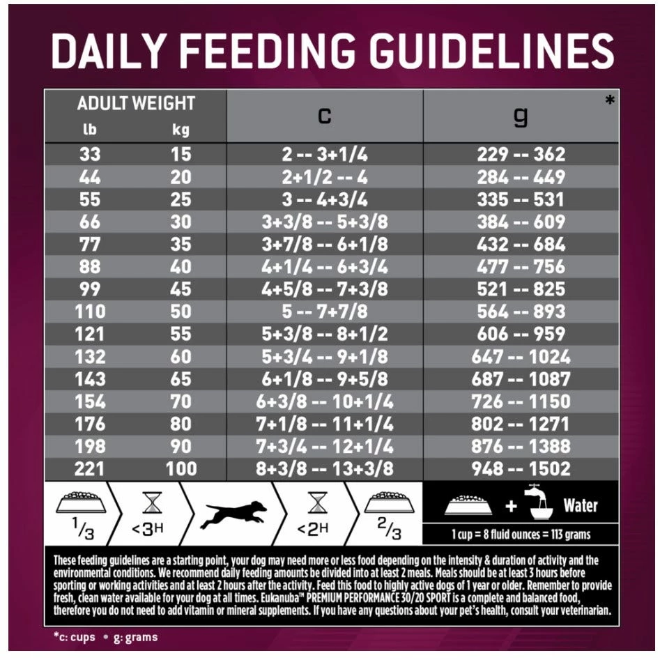 - Formulated for sporting, tracking, and working dogs with an optimal nutrient ratio of 30% protein and 20% fat to help maintain peak performance during daily and sustained activities