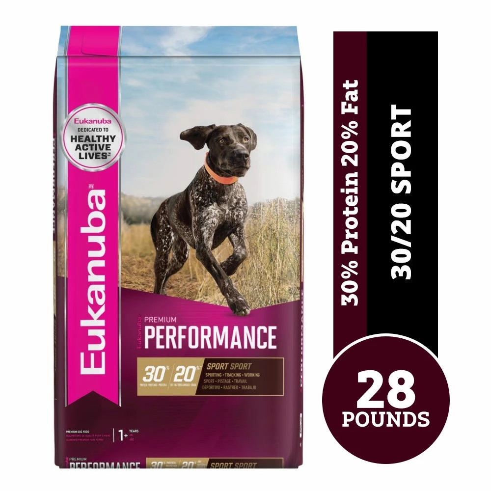 Help support your sporty sidekick’s active lifestyle with Eukanuba Premium Performance 30/20 SPORT Adult Dry Dog Food. This highly palatable kibble contains everything your canine companion needs, including the right balance of energy and nutrients, to help him reach and maintain peak performance. It contains a minimum of 30% protein and 20% fat with animal-based proteins that deliver essential amino acids. Essential amino acids help to strengthen and oxygenate your pup’s muscles as he exercises. This recipe also contains glucosamine, chondroitin sulfate and EPA to promote joint health and mobility, plus a blend of fibers and prebiotics supports healthy digestion. And with DHA and antioxidants, along with a scientifically tailored antioxidant blend, this dry dog food also supports healthy cognitive function and defends against free radicals!