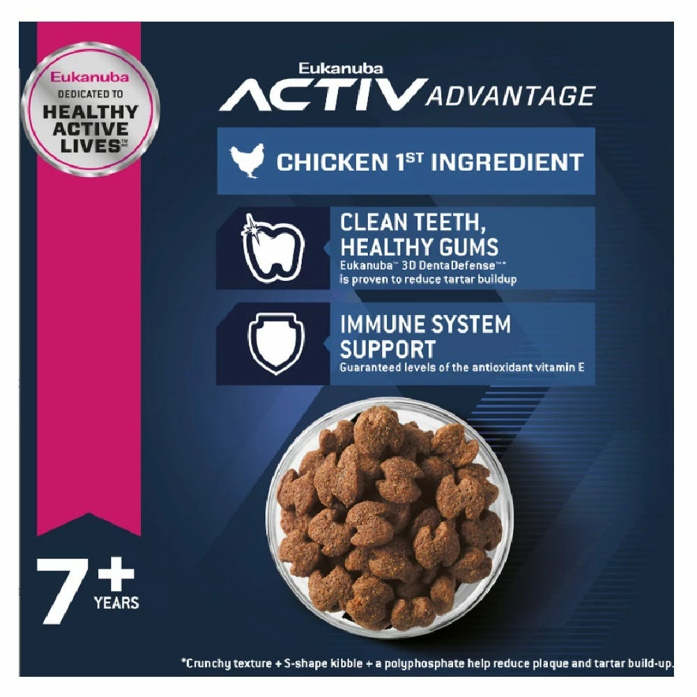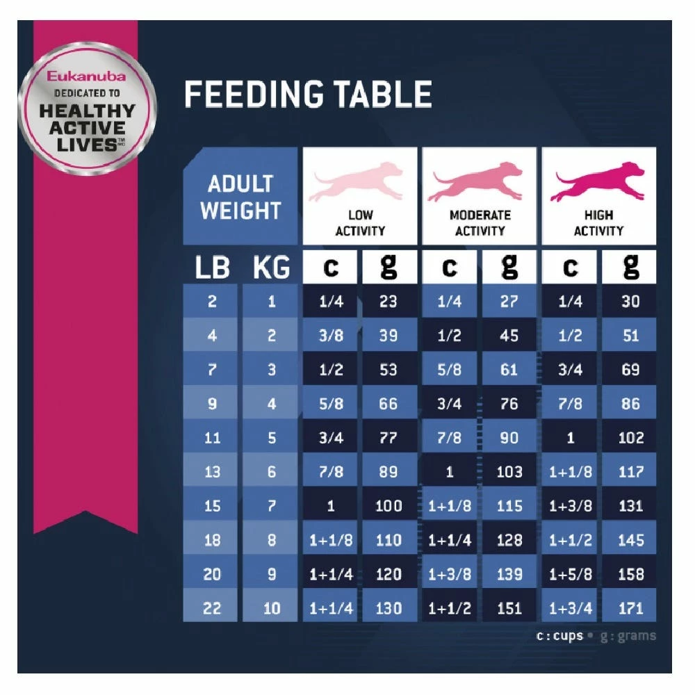 Your small dog is up for anything—from running to hiking to fetching—and it’ll take more than age to slow them down. Power their active lifestyle with Eukanuba Senior Small Breed dry dog food, a diet created specifically for your dog’s body, mind, and energy. High-quality chicken is always the first ingredient, because your lively senior deserves high-quality protein. Help keep your senior dog’s joints and muscles limber with glucosamine and chondroitin sulfate, and help them stay sharp with DHA and antioxidants to support healthy brain function. This diet is formulated with optimal amount of fats and carbohydrates to help maintain your older dog’s energy levels, while Eukanuba 3D DentaDefense* reduces tartar buildup to keep their teeth and gums healthy. This diet also provides immune system support to help strengthen your dog’s natural defenses. Pair it with Eukanuba Adult Wet Dog Food for the perfect complement to your active dog’s diet. Your hardworking dog is no ordinary senior, so feed them Eukanuba Senior Small Breed dry dog food and make their golden years the start of an extraordinary new adventure—satisfaction guaranteed. *Crunchy texture + S-shape kibble + a polyphosphate help reduce plaque and tartar build-up.