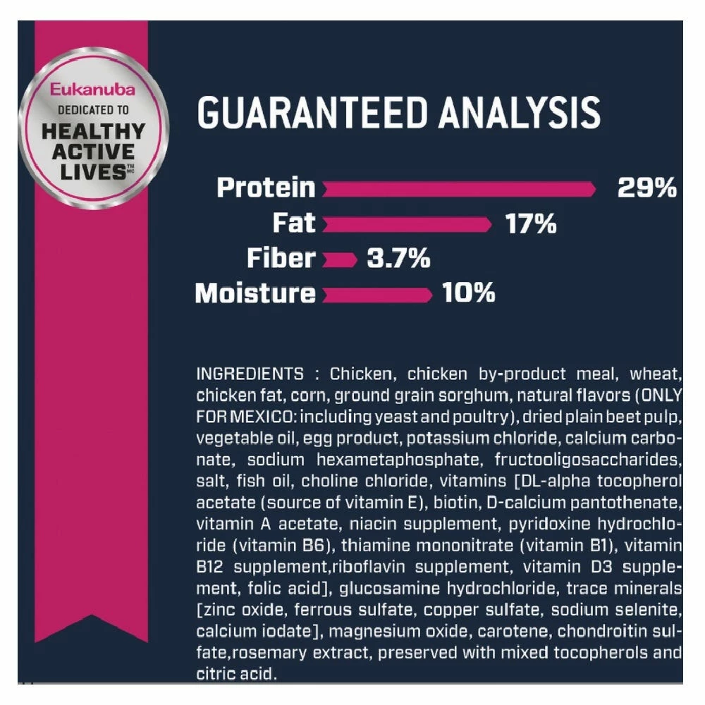 Chicken, Chicken By-Product Meal, Wheat, Chicken Fat, Corn, Ground Grain Sorghum, Natural Flavors, Dried Plain Beet Pulp, Vegetable Oil, Egg Product, Potassium Chloride, Calcium Carbonate, Sodium Hexametaphosphate, Fructooligosaccharides, Salt, Fish Oil, Choline Chloride, Vitamins [Dl-Alpha Tocopherol Acetate (Source Of Vitamin E), Biotin, D-Calcium Pantothenate, Vitamin A Acetate, Niacin Supplement, Pyridoxine Hydrochloride (Vitamin B6), Thiamine Mononitrate (Vitamin B1), Vitamin B12 Supplement, Riboflavin Supplement, Vitamin D3 Supplement, Folic Acid], Glucosamine Hydrochloride, Trace Minerals [Zinc Oxide, Ferrous Sulfate, Copper Sulfate, Sodium Selenite, Calcium Iodate], Magnesium Oxide, Carotene, Chondroitin Sulfate, Rosemary Extract, Preserved With Mixed Tocopherols And Citric Acid.
