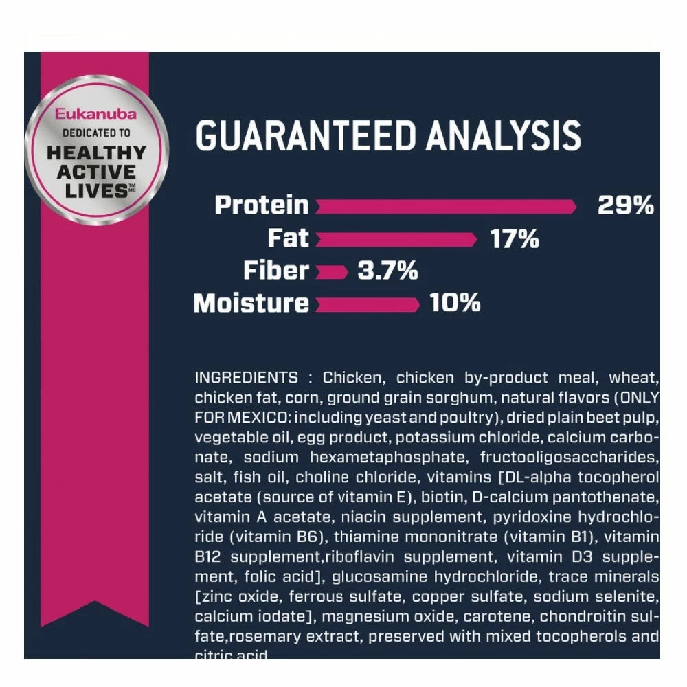 Chicken, Chicken By-Product Meal, Wheat, Chicken Fat, Corn, Ground Grain Sorghum, Natural Flavors, Dried Plain Beet Pulp, Vegetable Oil, Egg Product, Potassium Chloride, Calcium Carbonate, Sodium Hexametaphosphate, Fructooligosaccharides, Salt, Fish Oil, Choline Chloride, Vitamins [Dl-Alpha Tocopherol Acetate (Source Of Vitamin E), Biotin, D-Calcium Pantothenate, Vitamin A Acetate, Niacin Supplement, Pyridoxine Hydrochloride (Vitamin B6), Thiamine Mononitrate (Vitamin B1), Vitamin B12 Supplement, Riboflavin Supplement, Vitamin D3 Supplement, Folic Acid], Glucosamine Hydrochloride, Trace Minerals [Zinc Oxide, Ferrous Sulfate, Copper Sulfate, Sodium Selenite, Calcium Iodate], Magnesium Oxide, Carotene, Chondroitin Sulfate, Rosemary Extract, Preserved With Mixed Tocopherols And Citric Acid.