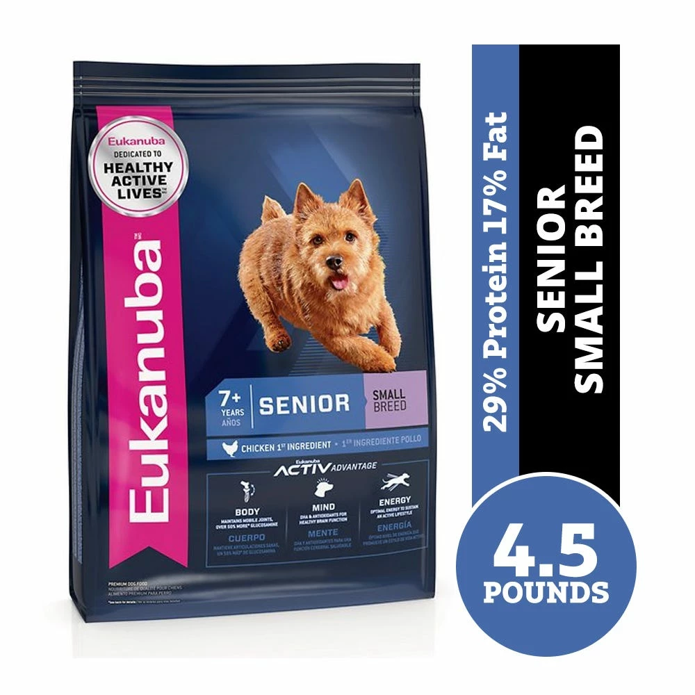 - Eukanuba Senior Small Breed dry dog food is complete and balanced nutrition for senior dogs over 7 years old weighing up to 23 lbs.