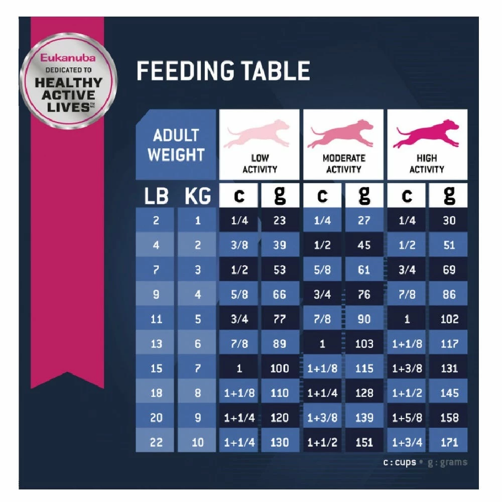 Your small dog is up for anything—from running to hiking to fetching—and it’ll take more than age to slow them down. Power their active lifestyle with Eukanuba Senior Small Breed dry dog food, a diet created specifically for your dog’s body, mind, and energy. High-quality chicken is always the first ingredient, because your lively senior deserves high-quality protein. Help keep your senior dog’s joints and muscles limber with glucosamine and chondroitin sulfate, and help them stay sharp with DHA and antioxidants to support healthy brain function. This diet is formulated with optimal amount of fats and carbohydrates to help maintain your older dog’s energy levels, while Eukanuba 3D DentaDefense* reduces tartar buildup to keep their teeth and gums healthy. This diet also provides immune system support to help strengthen your dog’s natural defenses. Pair it with Eukanuba Adult Wet Dog Food for the perfect complement to your active dog’s diet. Your hardworking dog is no ordinary senior, so feed them Eukanuba Senior Small Breed dry dog food and make their golden years the start of an extraordinary new adventure—satisfaction guaranteed. *Crunchy texture + S-shape kibble + a polyphosphate help reduce plaque and tartar build-up.