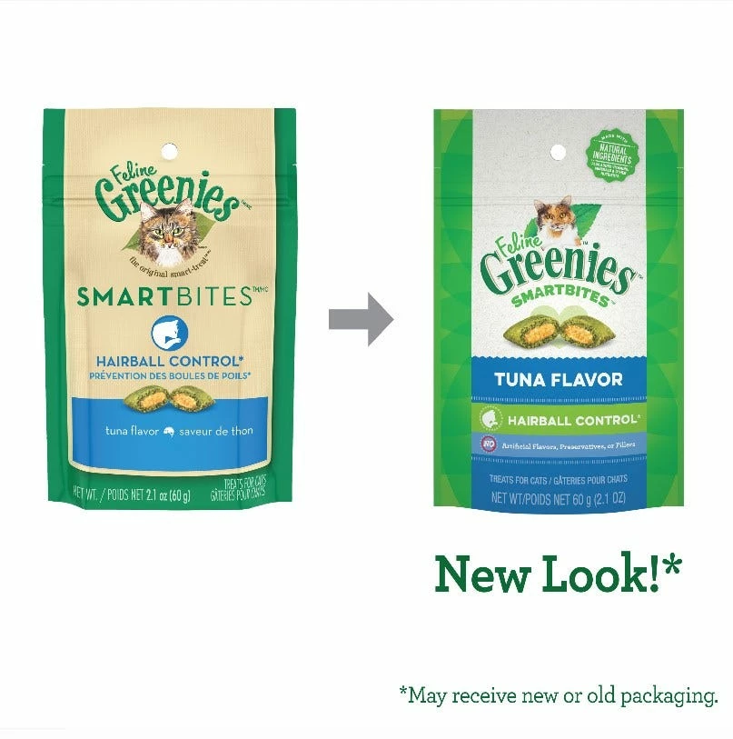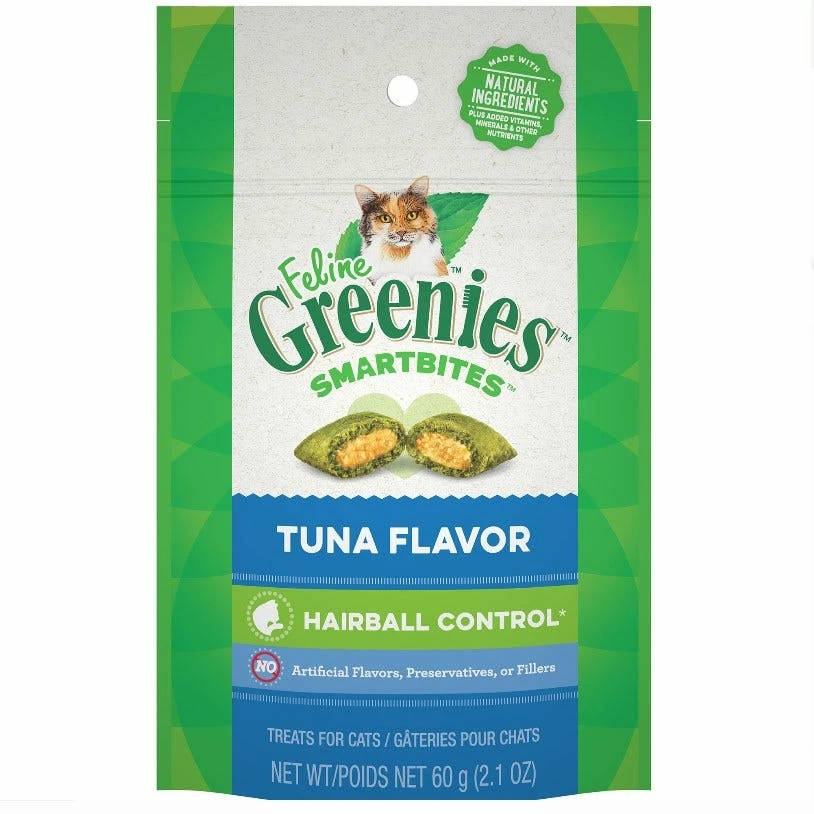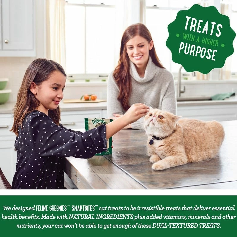 Feline Greenies Smartbites Healthy Indoor Treats for Cats are the perfect treat to keep your cat purring all day long. Created with Greenies Fiberblend Formula, these treats help support healthy digestion, have high quality protein to support muscles, and at less than 2 calories per treat help your cat maintain a healthy weight. These Smartbites treats feature a mix of crunchy and creamy textures as well as added vitamins, minerals, and other nutrients for a nutritionally complete and balanced snack. Plus, these irresistible little treats come in a delectable chicken flavor and are made with natural ingredients, plus vitamins. They’re also the perfect sized treats for cat toys… try placing a few inside a treat dispenser toy and watch your cat chase and swat away! These Feline Greenies are the healthy, tasty treats your cat will love!