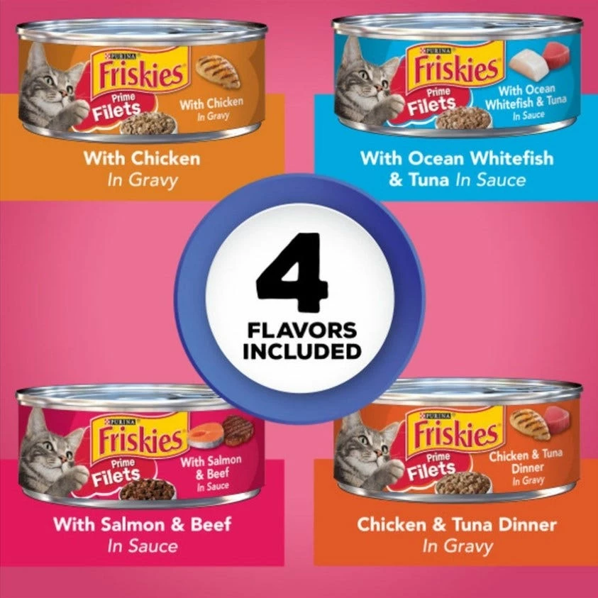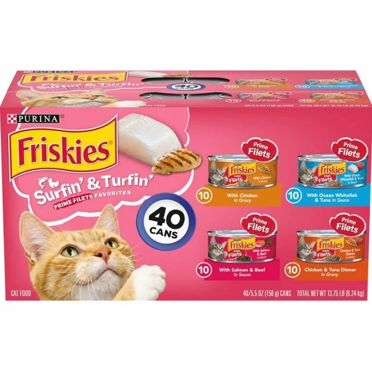 Give your pal a bowlful of kitty-approved flavor and nutrition with the Friskies Surfin’ & Turfin’ Favorites Variety Pack Canned Cat Food. These tasty pate recipes feature nutritious real meat, and are packed with everything your cat needs to stay looking and feeling his best, like protein, antioxidants and healthy omegas. Plus, the formula is enhanced with vitamins, minerals and essential taurine for nose-to-tail well-being in every bite. Since it’s made with plenty of moisture, it also helps keep your pal hydrated while helping support urinary health. So open up the easy pull tab and turn mealtime into yum time.