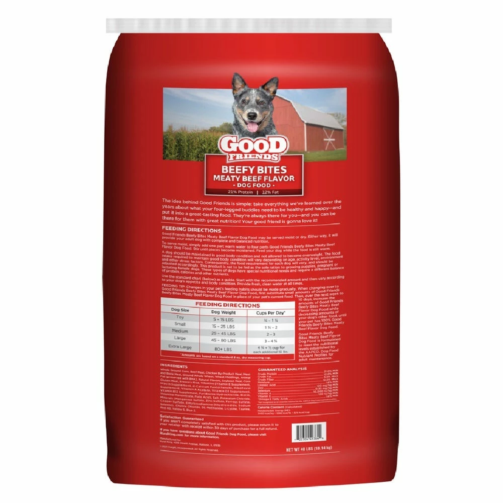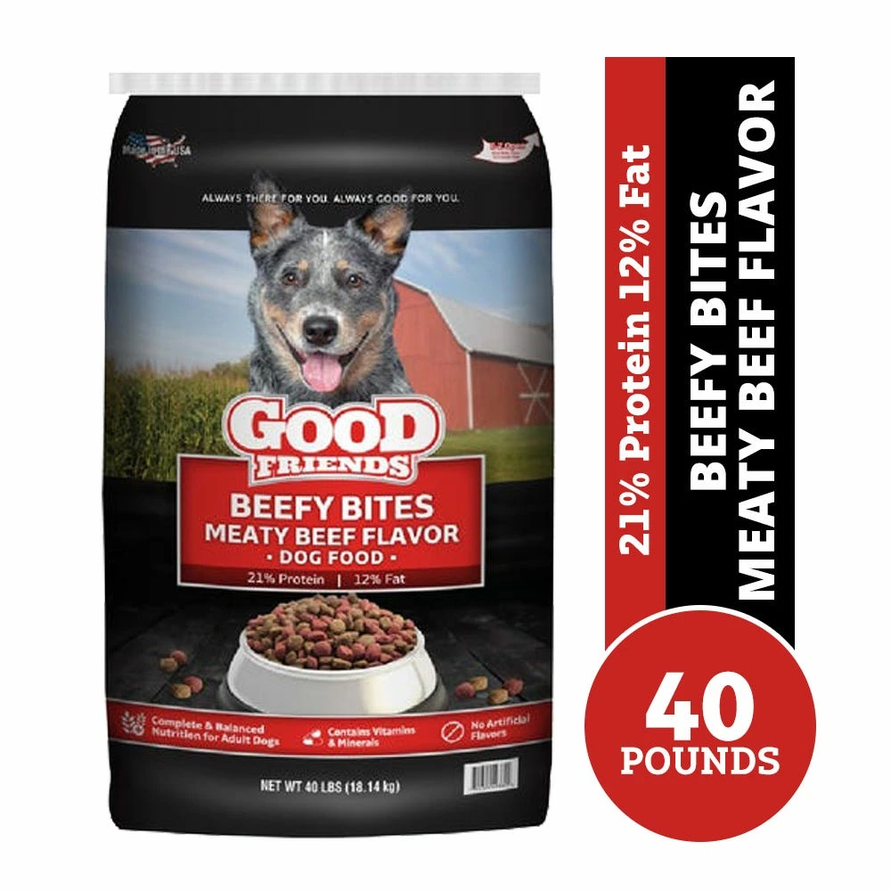 Good Friends Beefy Bites Meaty Beef Flavor Dog Food is formulated to meet the nutritional levels established by the AAFCO. Dog Food Nutrient Profiles for adult maintenance.