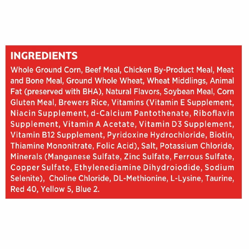 Whole Ground Com, Beef Meal, Chicken By-Product Meal, Meat &Bone Meal, Ground Whole Wheat, Wheat Middling’s, Animal Fat (Preserved with BHA), (source of Beef Flavor) Animal Fat (preserved