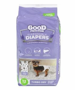 These Good Friends Disposable diapers are great to use for incontinence issues, females in heat, excitable urination, and travel. They have a fresh lavender scent and an adorable design. The super absorbent gel core will keep your dog feeling comfortable and dry.