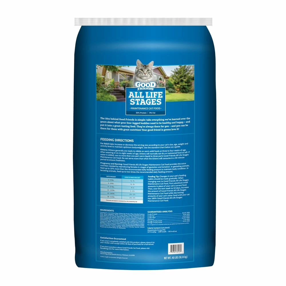 Feeding Tip: Changes in your pet’s feeding habits should be made gradually. When changing over to Good Friends All Life Stages Maintenance Cat Food, first substitute small amounts in place of your cat’s current food. Then, over the next week to 10 days, increase the amount of Good Friends All Life Stages Maintenance Cat Food while decreasing amounts of your cat’s other food until your cat has 100% Good Friends All Life Stages Maintenance Cat Food. Good Friends All Life Stages Maintenance Cat Food is formulated to meet the nutritional levels established by the AAFCO Cat Nutrient Profiles for all life stages.